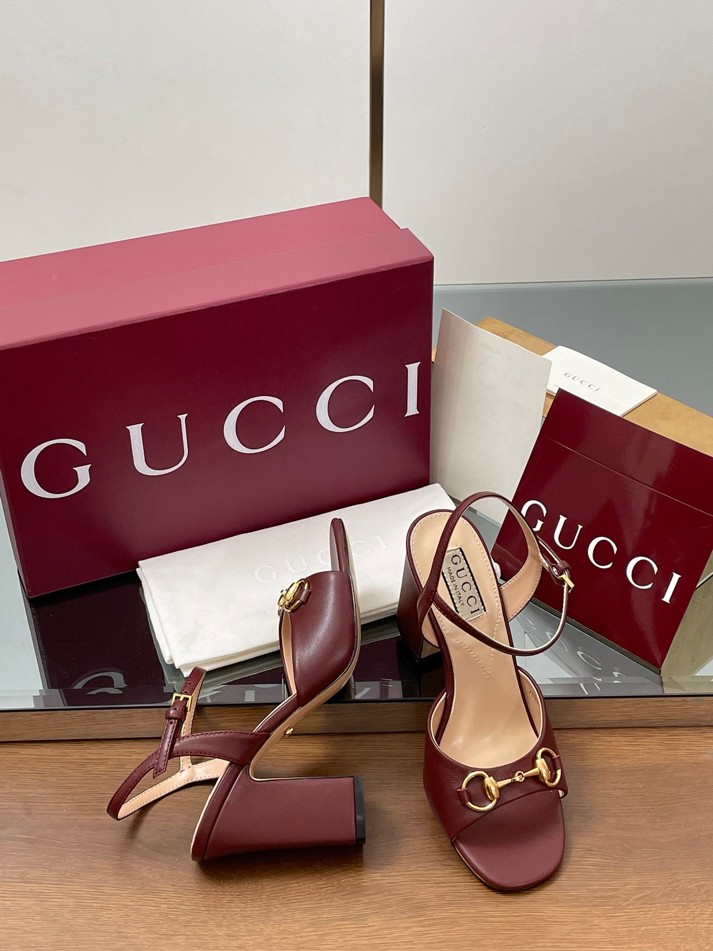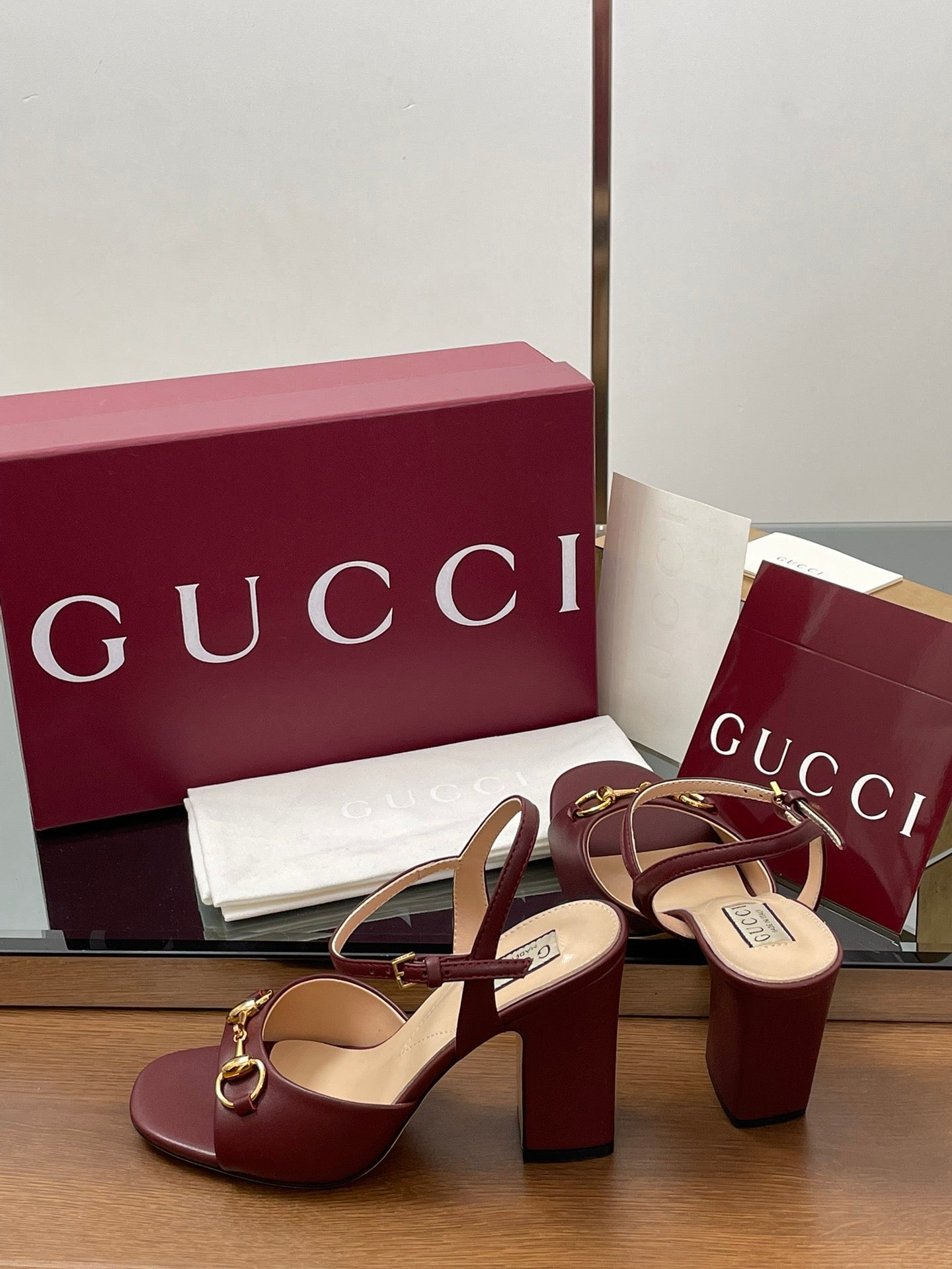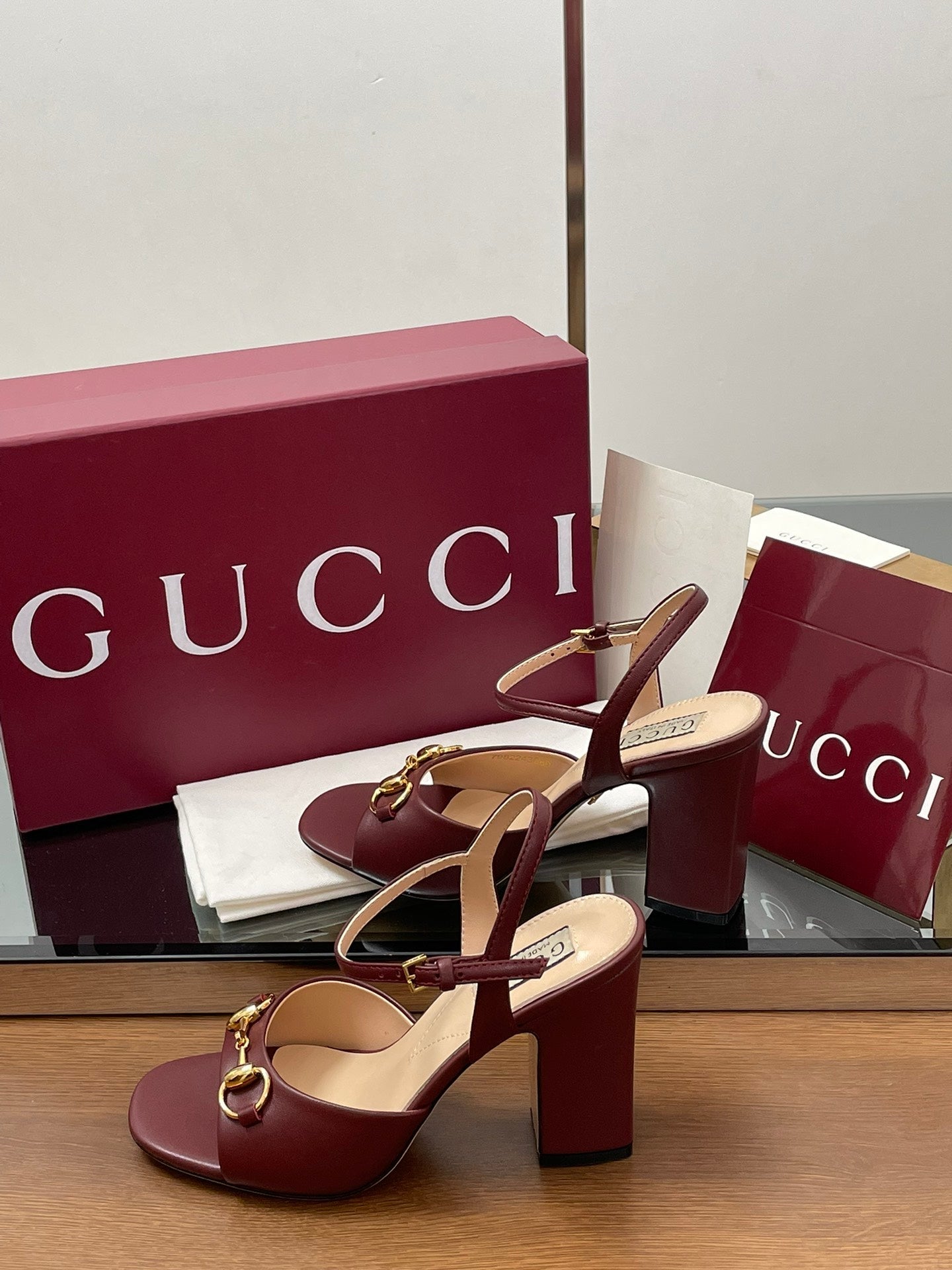 GG Women Horsebit High Heel Sandal Open Toe Burgundy Sheepskin 225968