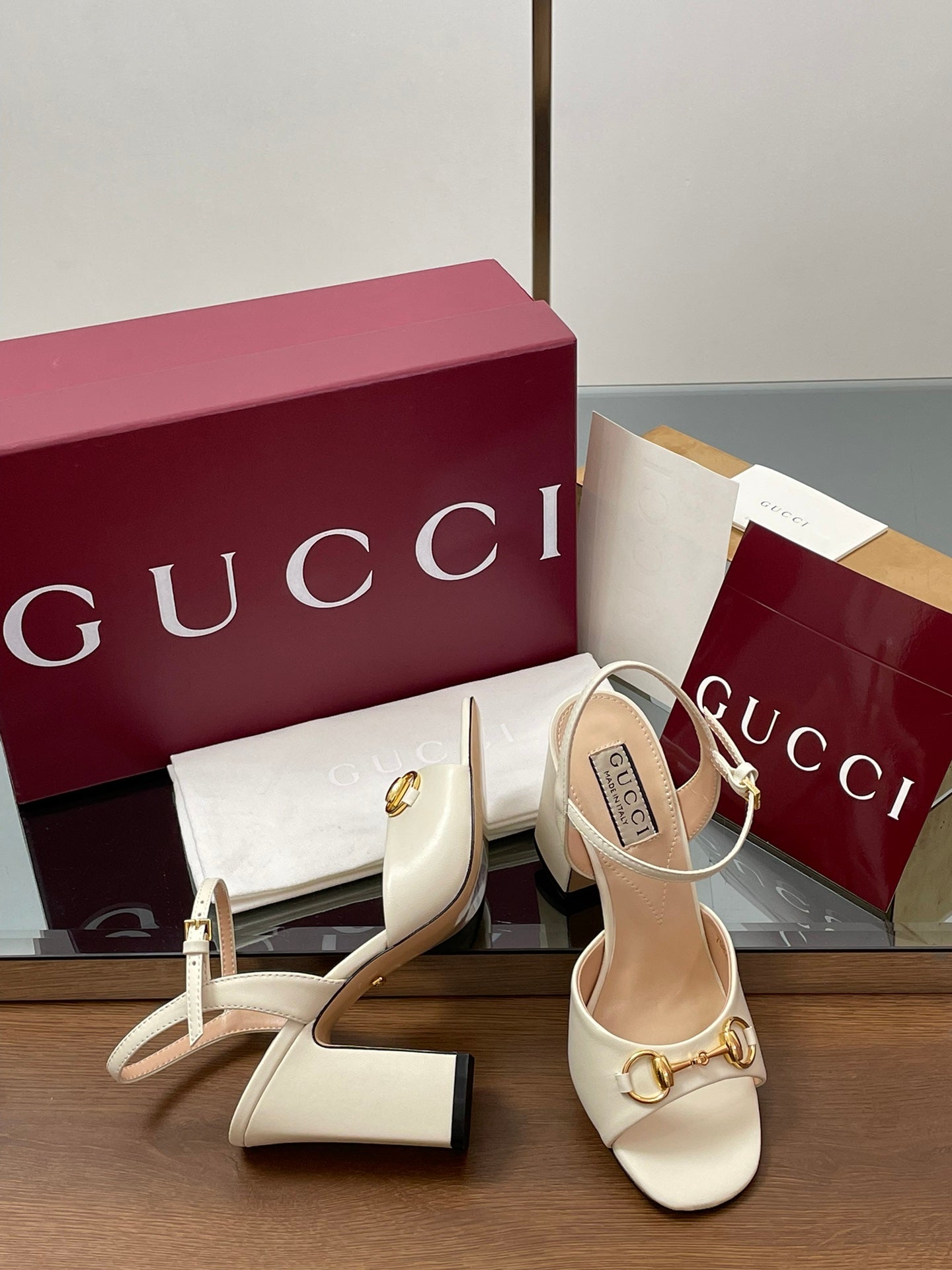 GG Women Horsebit High Heel Sandal Open Toe Cream Sheepskin 225969