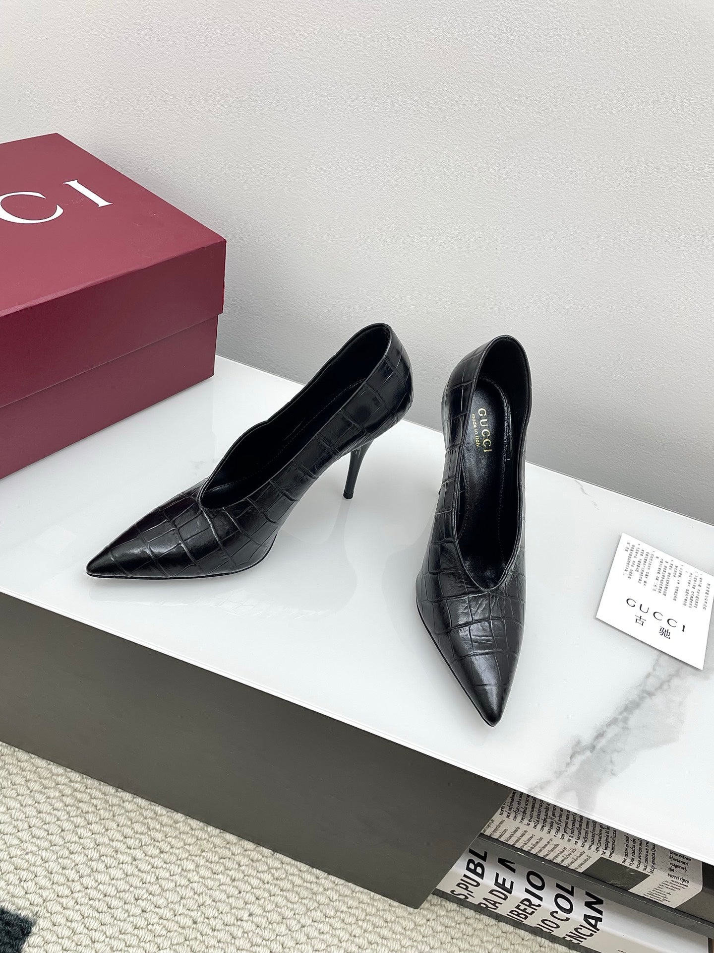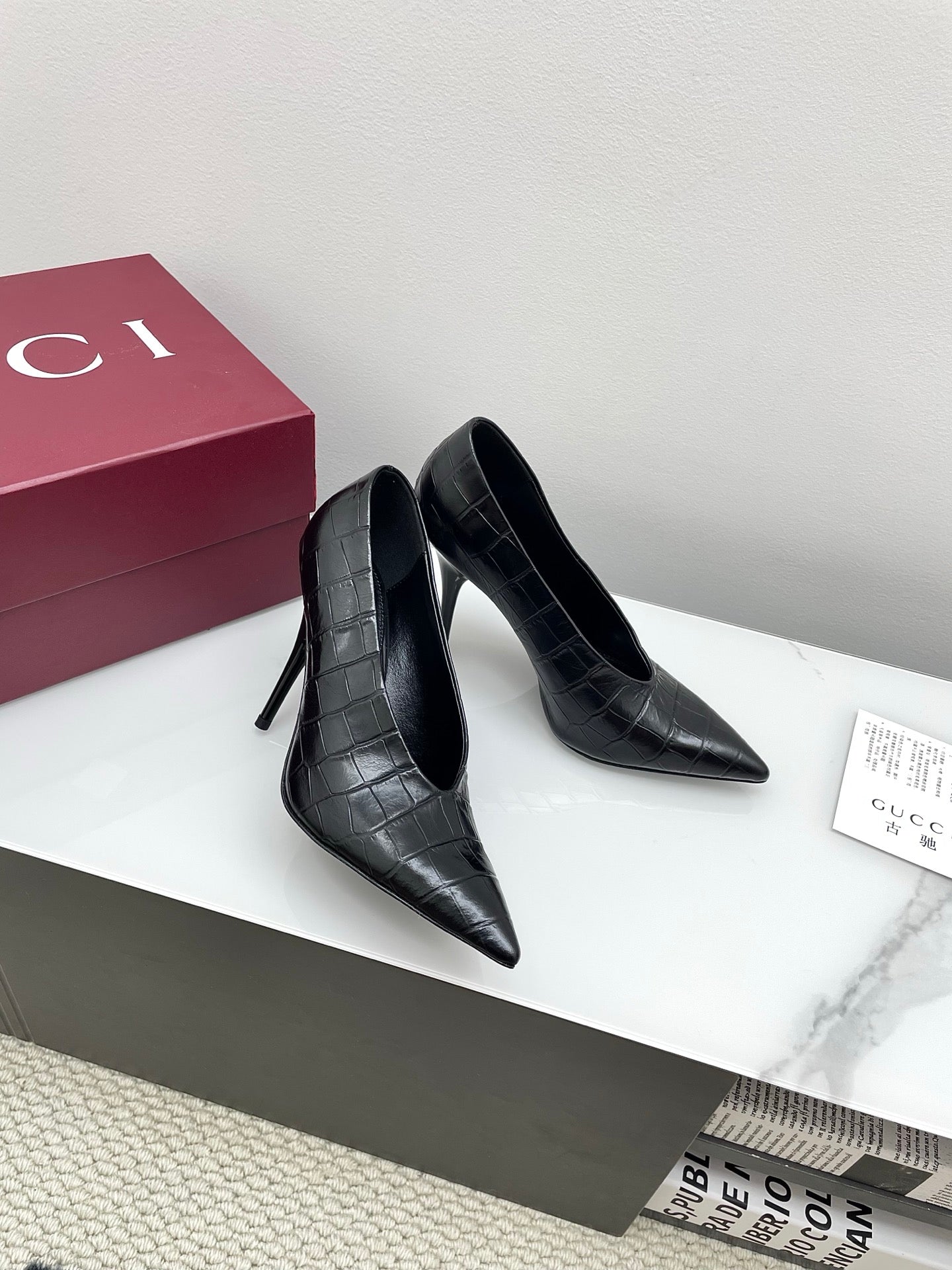 GG 25Ss Crocodile Pattern Pointed Toe High Heels Black Leather 511499