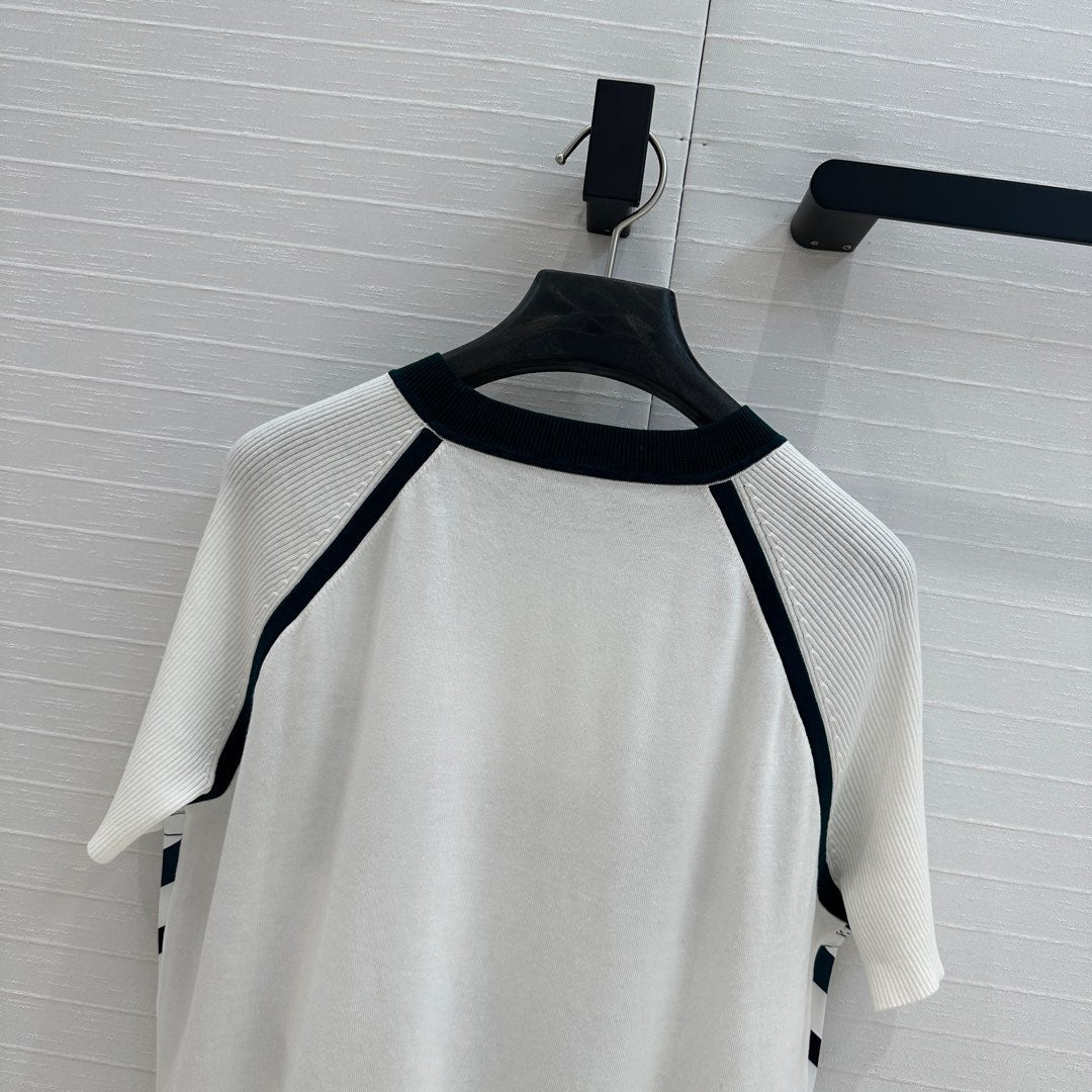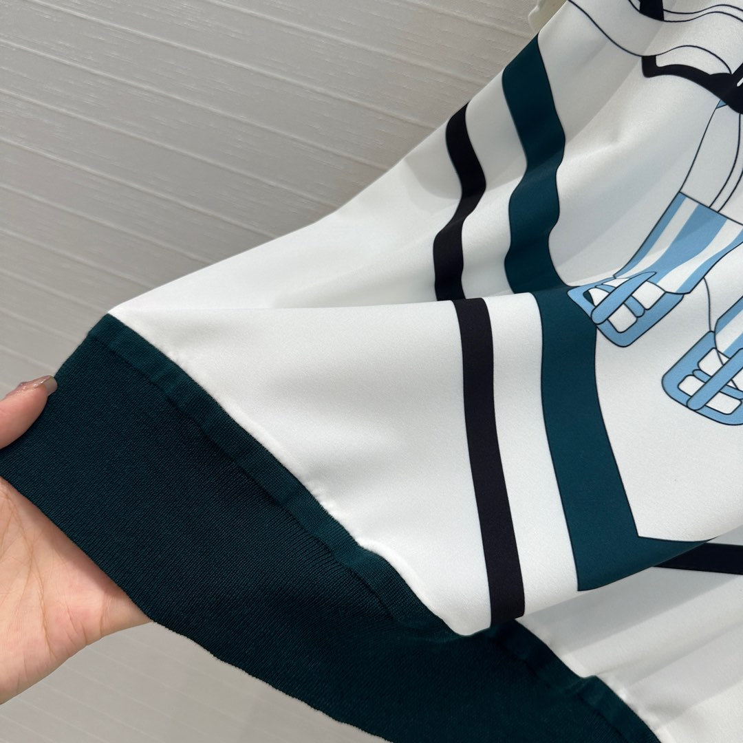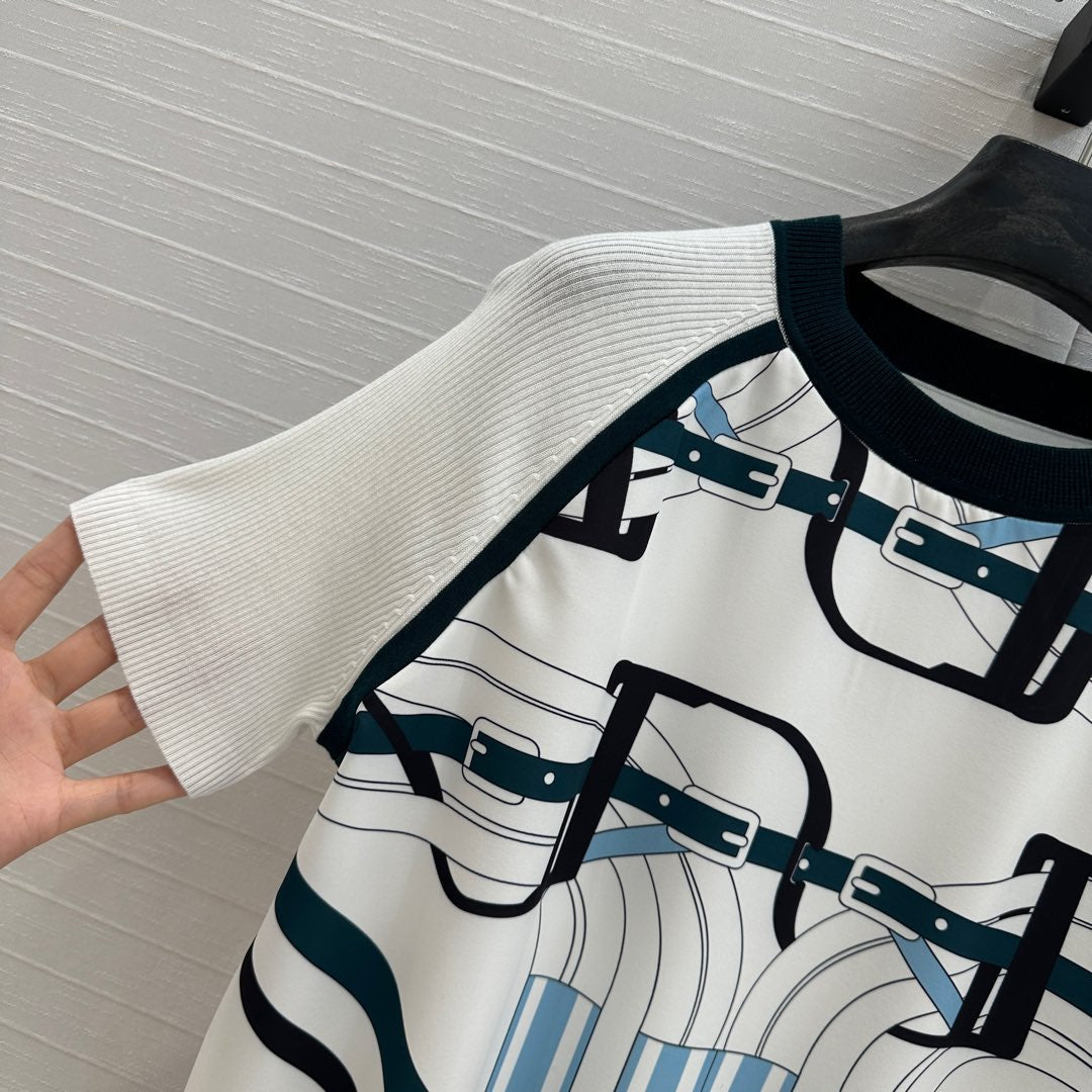 Hm 25 Print Patchwork Knit Top White Blue Tencel Wool