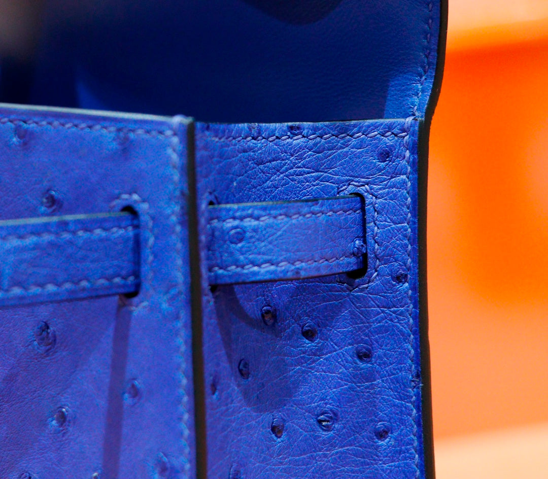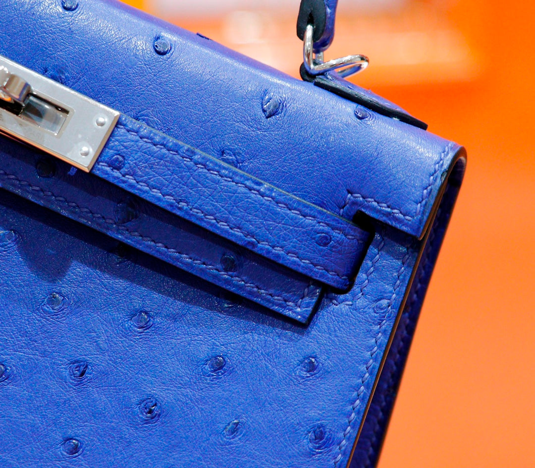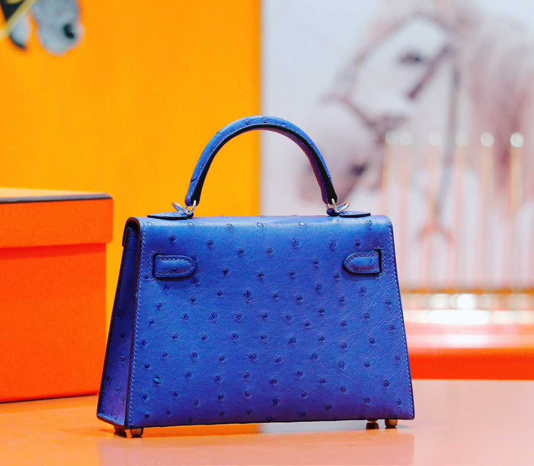 HM Mini Kelly 19cm Greek Blue Ostrich Silver Hardware