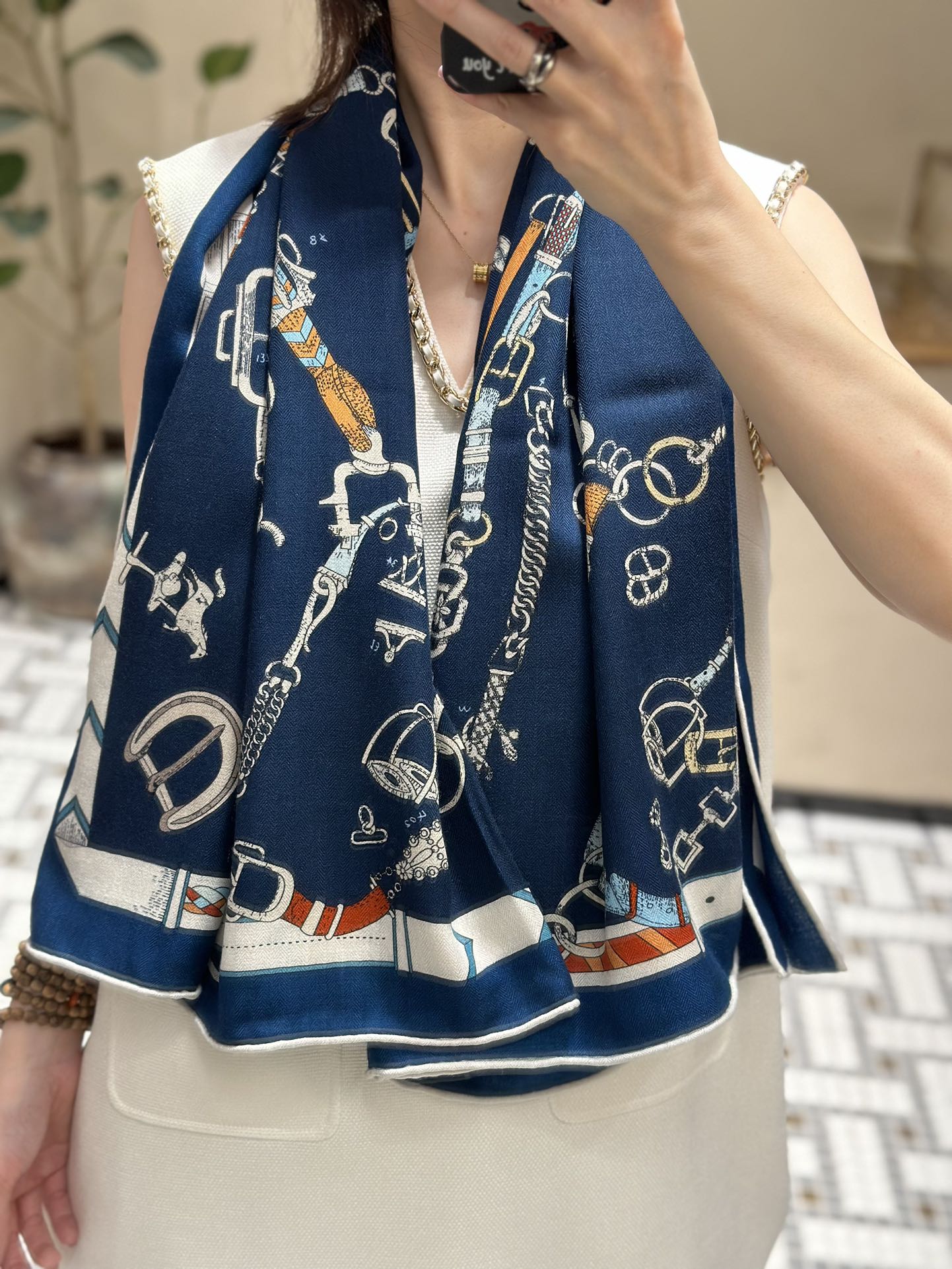 Chevaux Dechaines Shawl 135 CM IN Dark Blue Colorful Cashmere Silk 373682
