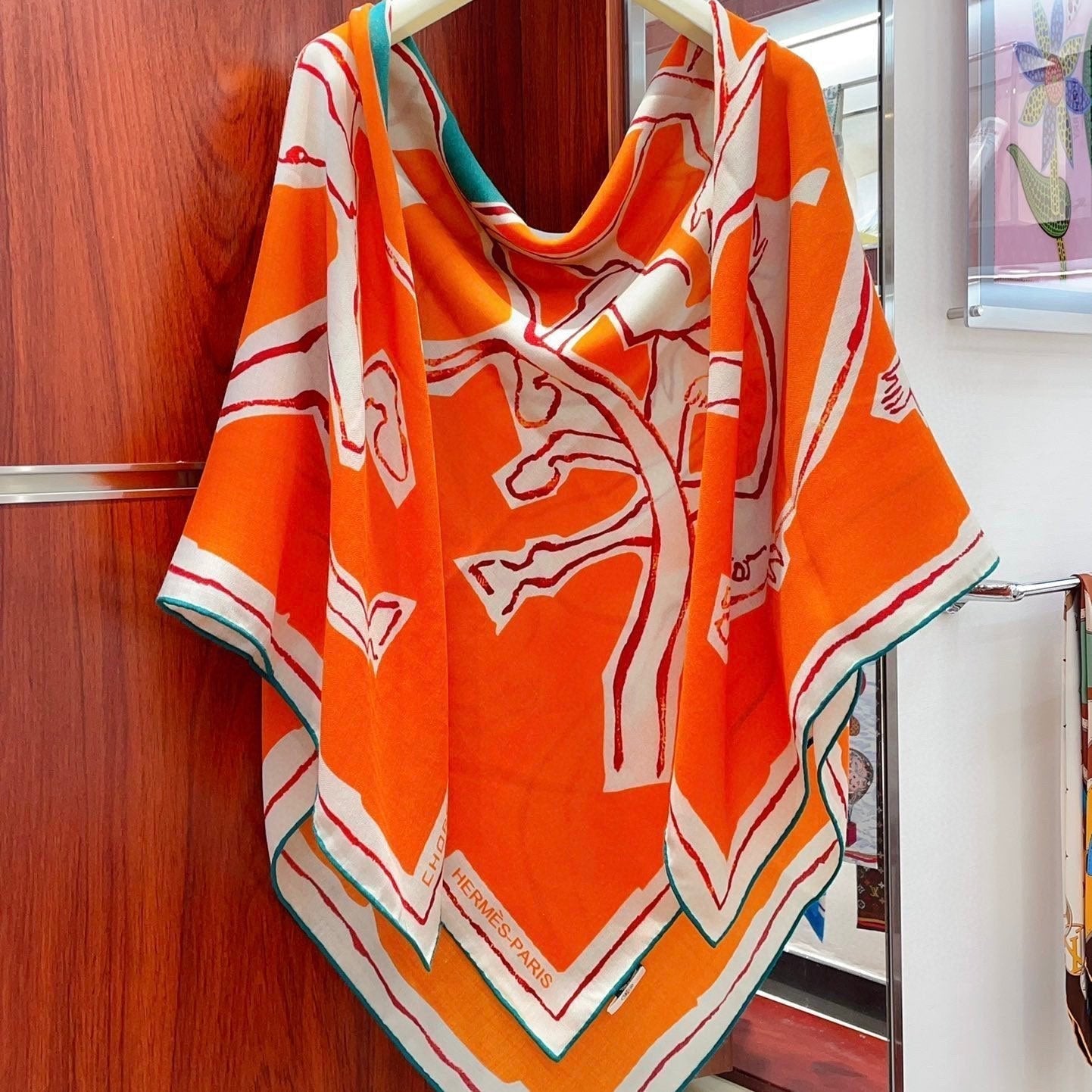 Chevaux Dechaines Shawl 135 CM IN Orange Colorful Cashmere Silk 373685