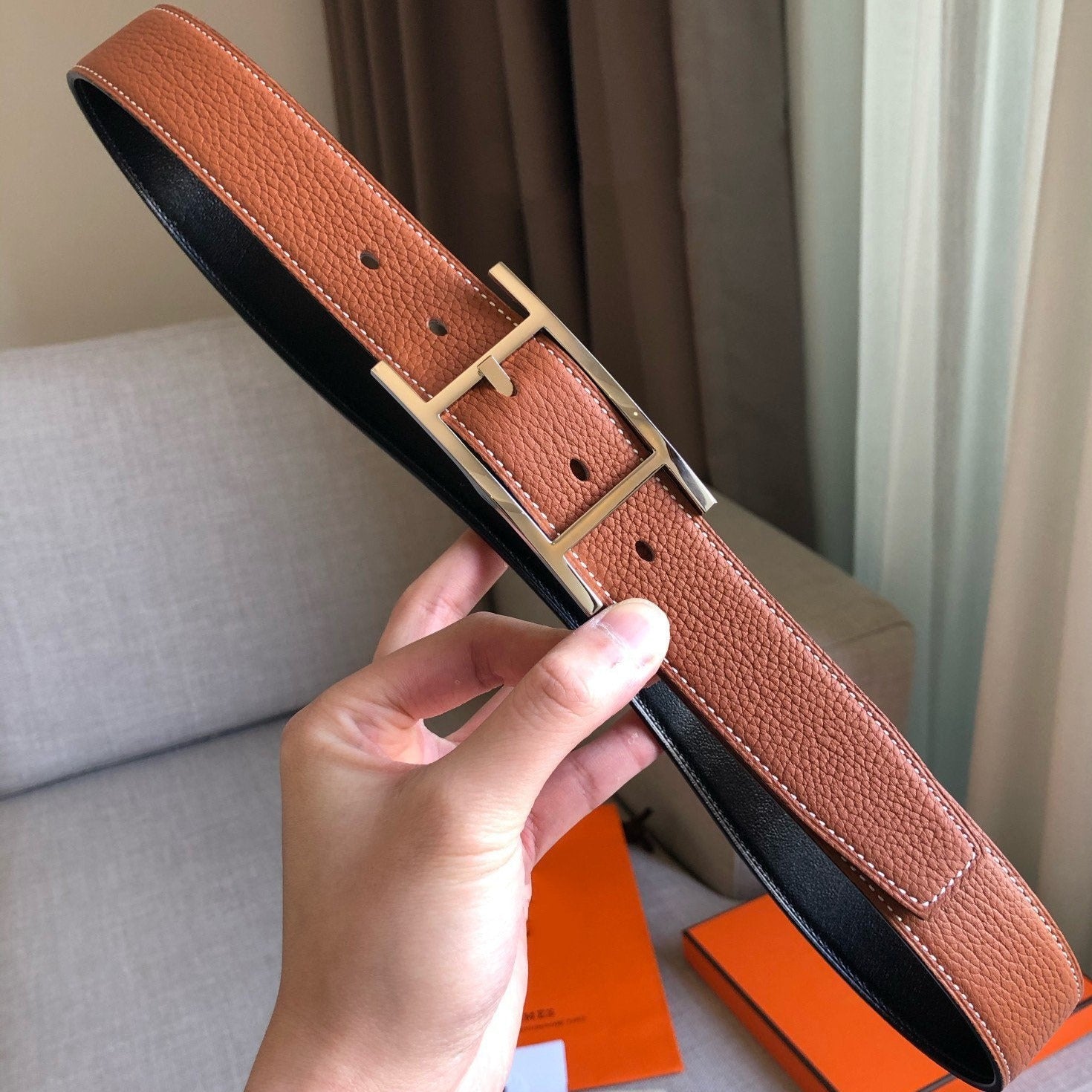 H BELT SILVER BUCKLE BROWN BLACK LEATHER REVERSIBLE 3.2CM