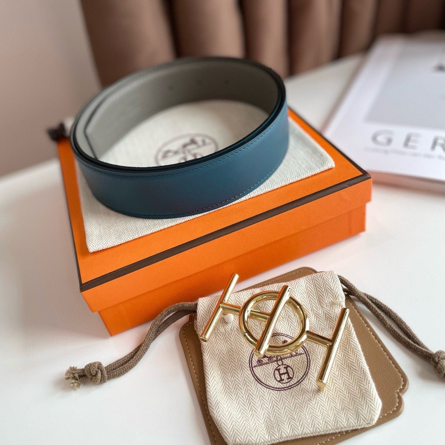 H ULYSSE BELT 38MM GOLD BUCKLE BLUE GREY LEATHER