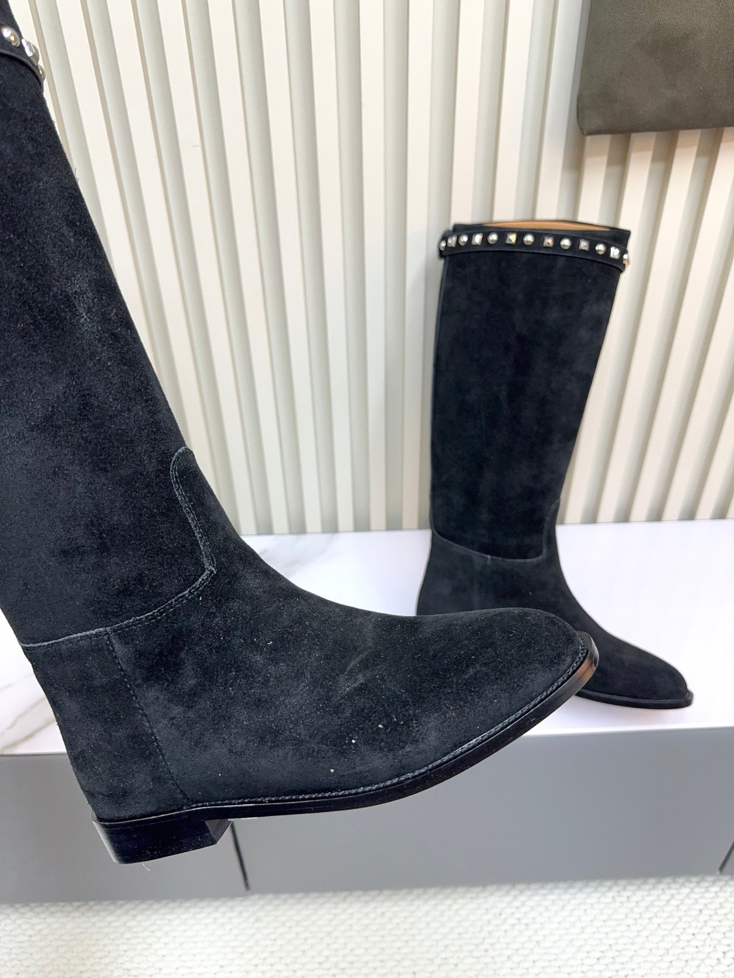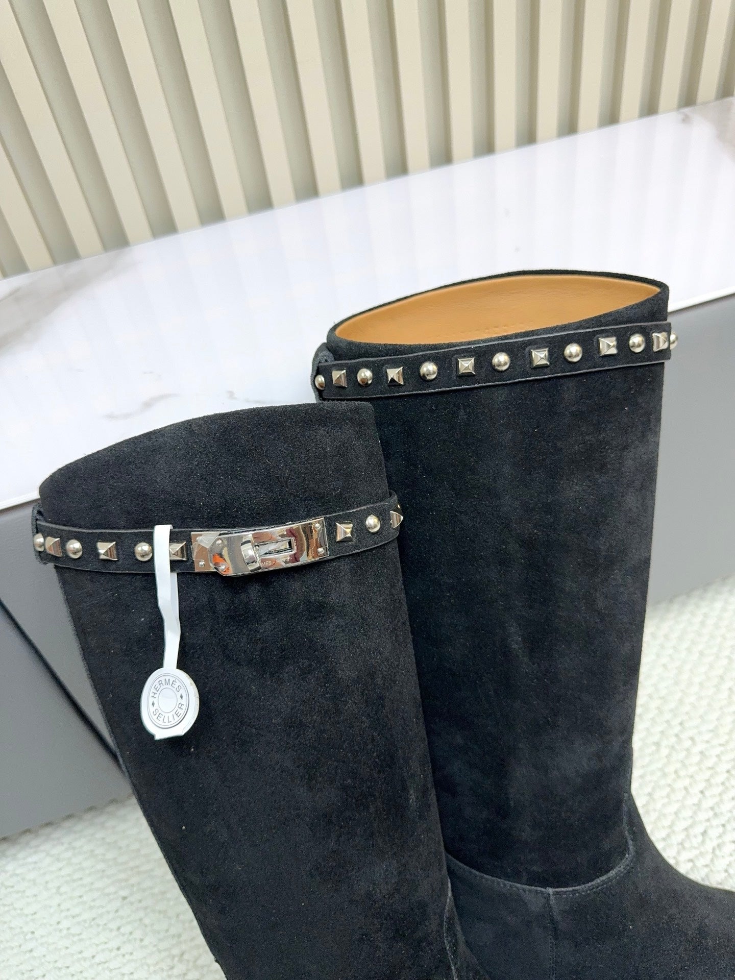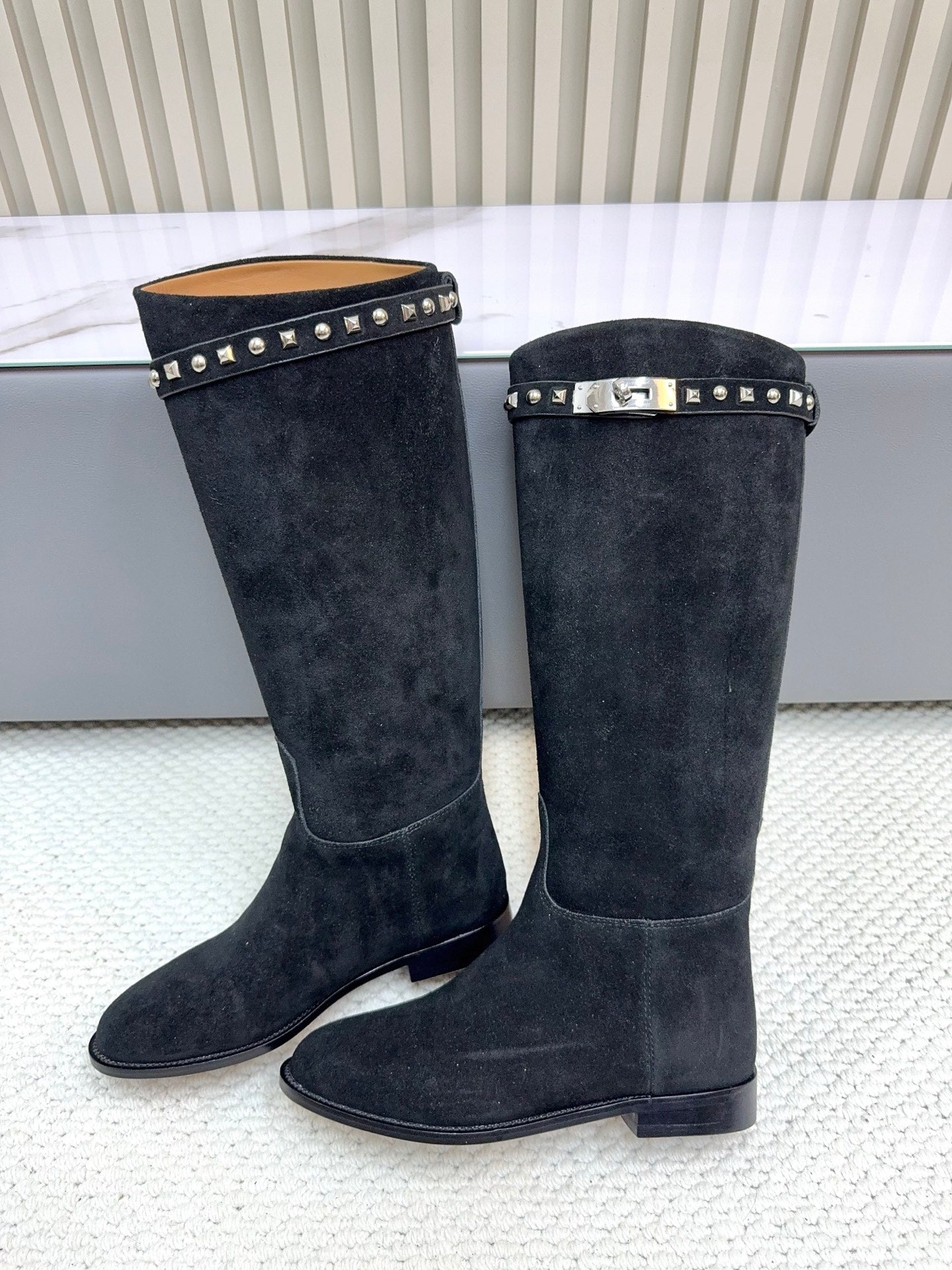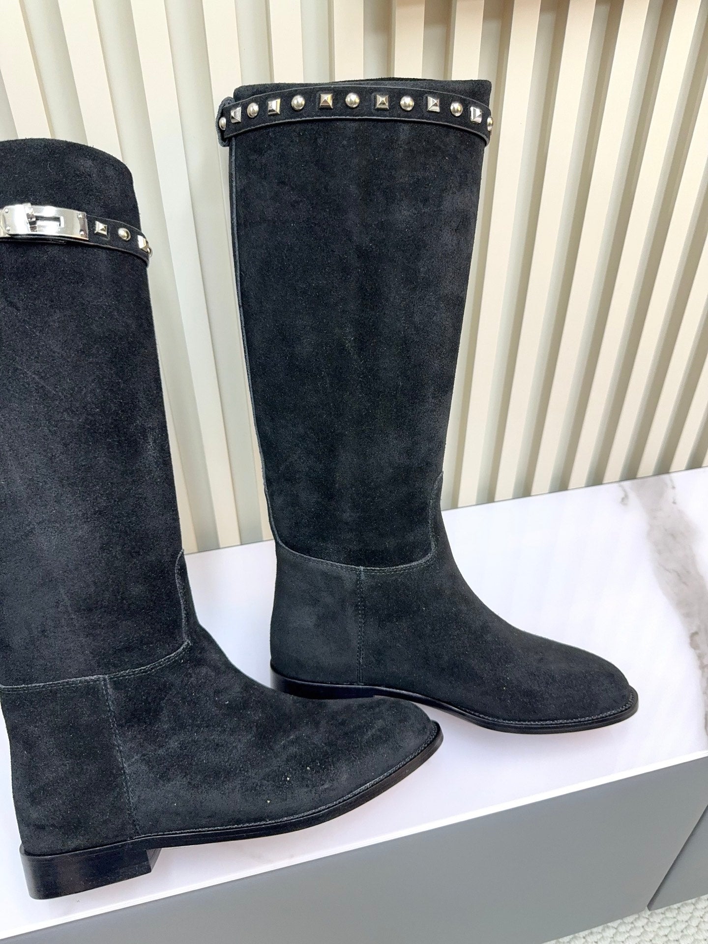HM 25ss Kelly Buckle Riding Boots Black Suede 576117