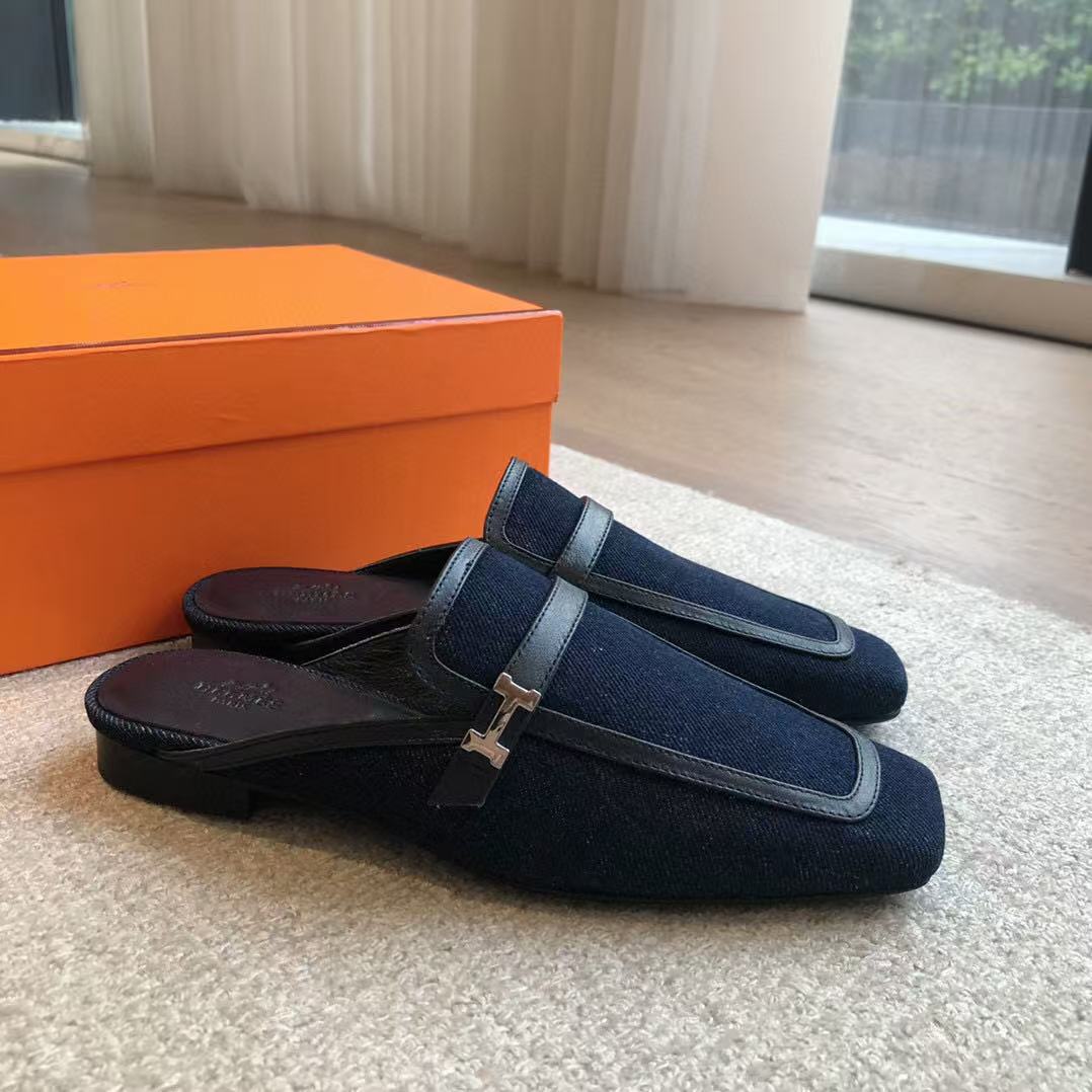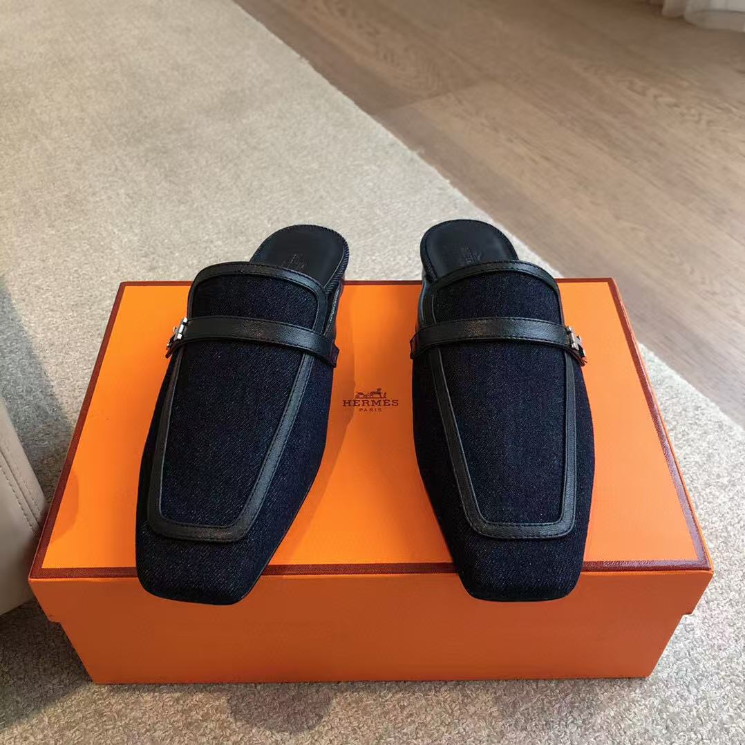Hermès Pre-Owned Logo-buckle Loafers Blue Black Denim Leather