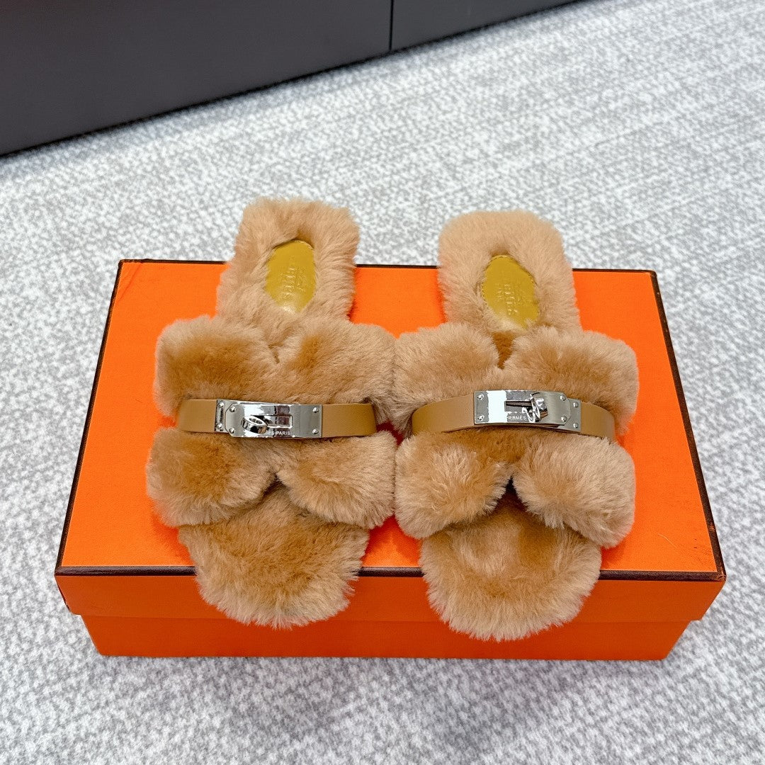 HM 25s H Shaped Slipper with Buckle Light Brown Shearling 462193