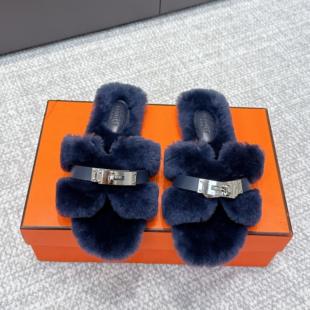 HM 25s H Shaped Slipper with Buckle Navy Blue Shearling 462192
