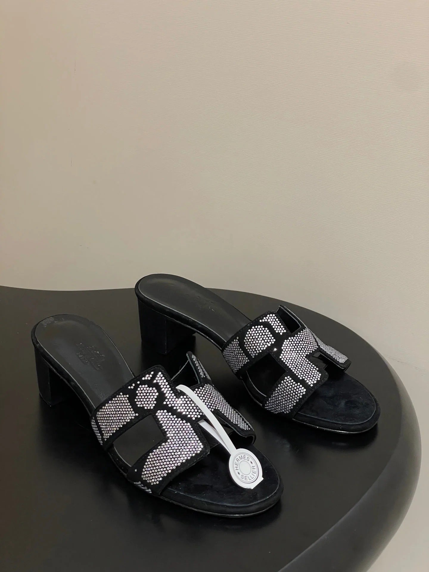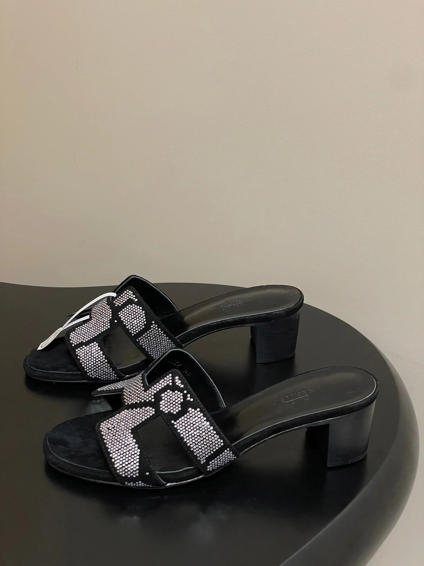 HM 25S ORAN HIGH‑HEEL SANDAL 50 MM IN BLACK LAMBSKIN WITH WHITE STONE DETAILS