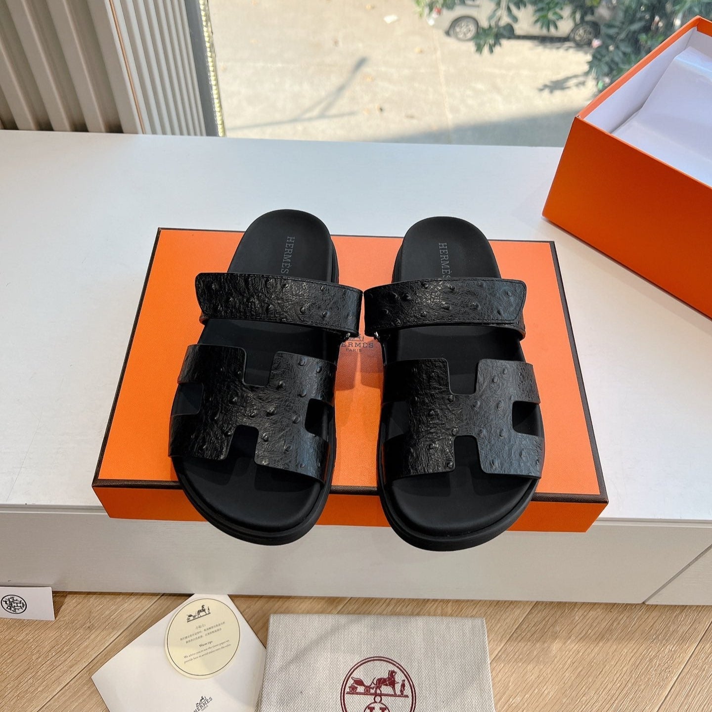 HM Chypre Sandal Black Ostrich Leather 202800