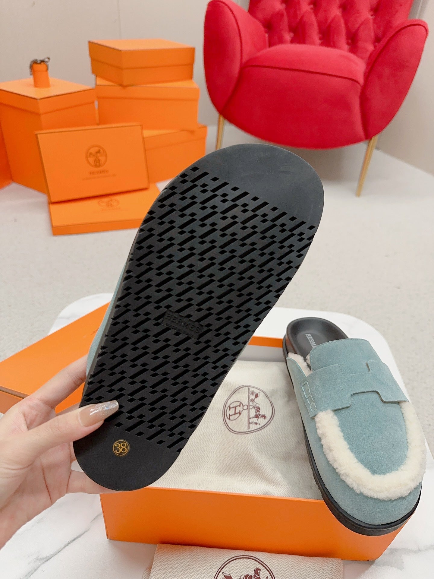 HM Go Mule Teal-gray White Suede Lined With Wool Fleece 476592