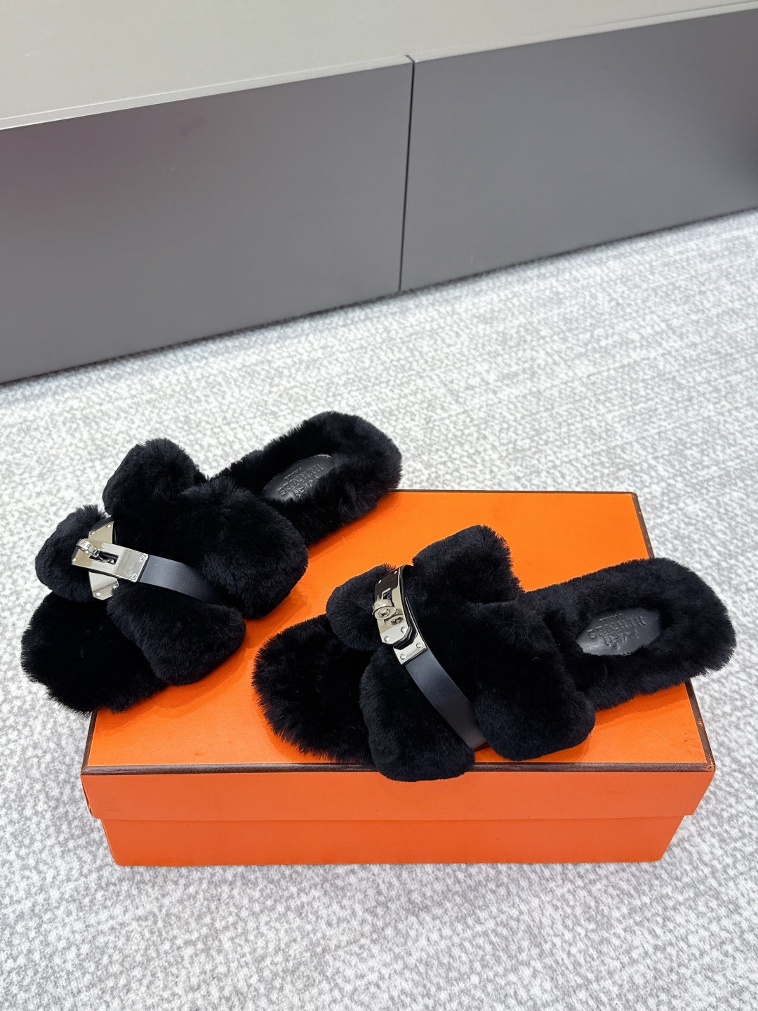 HM 25s H Shaped Slipper with Buckle Black Shearling 462196