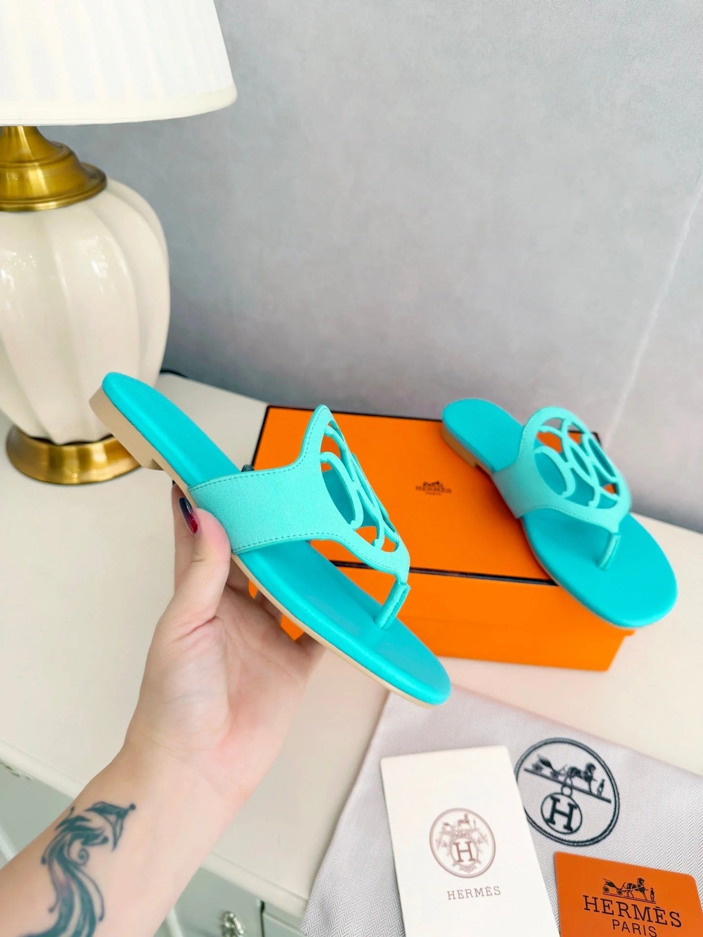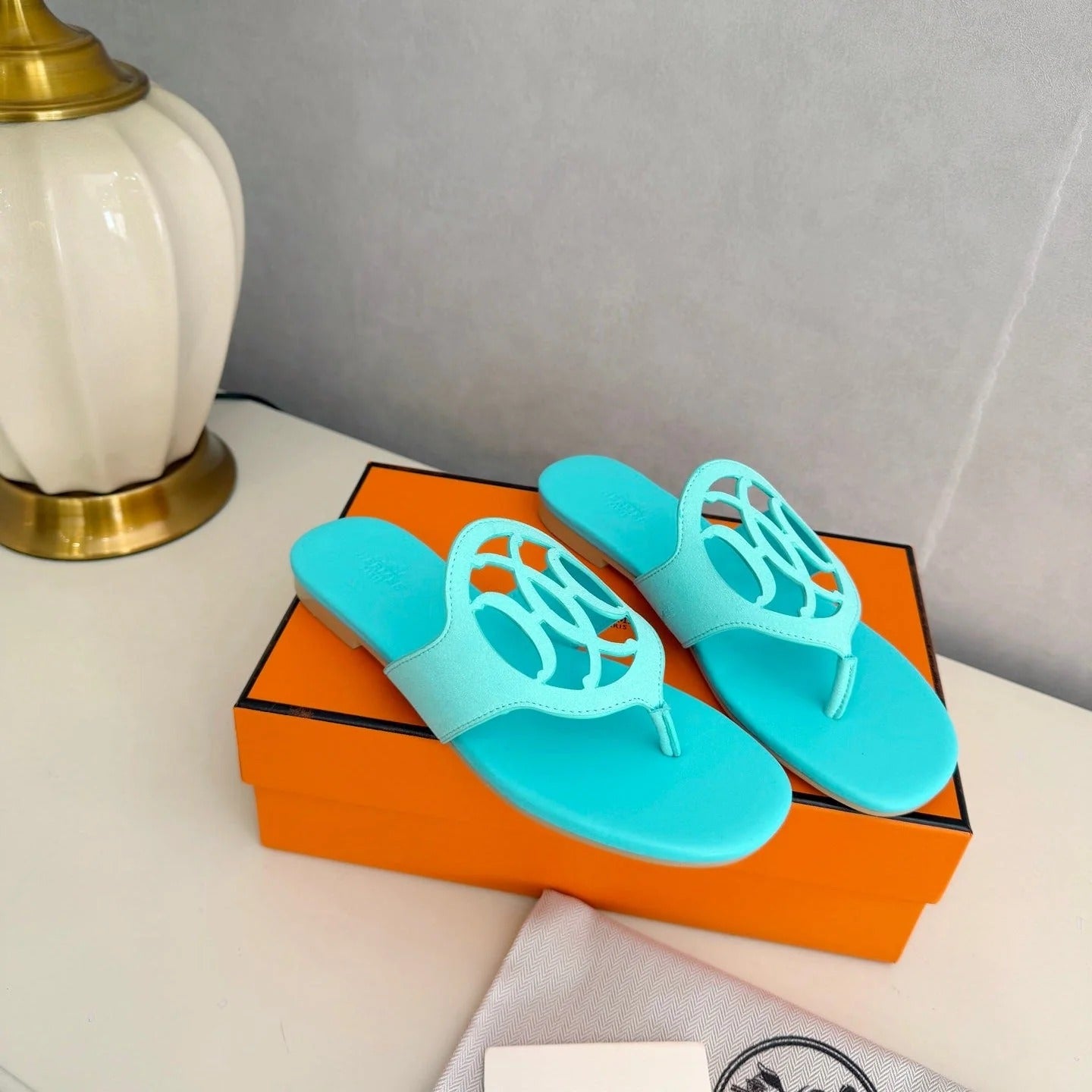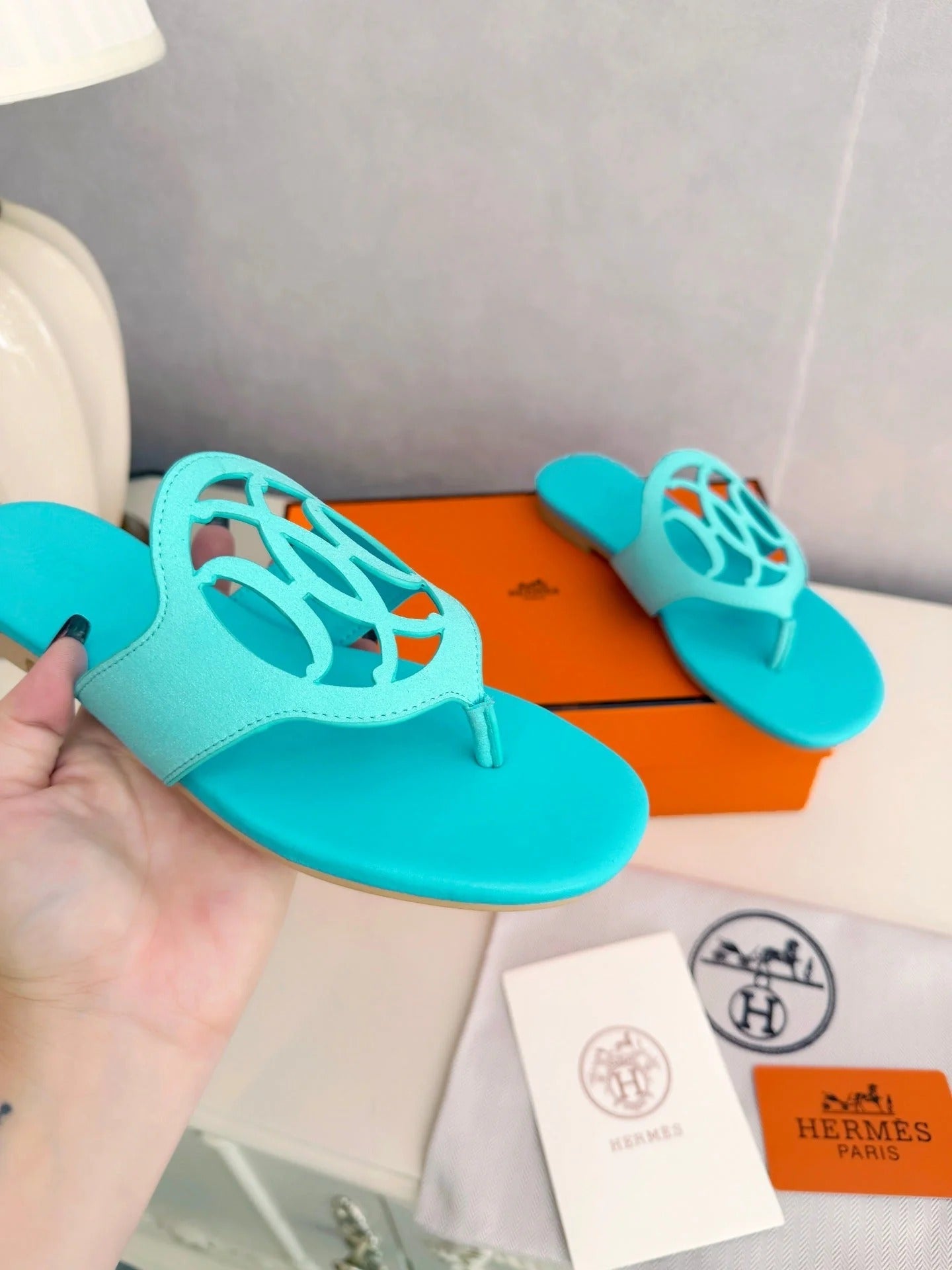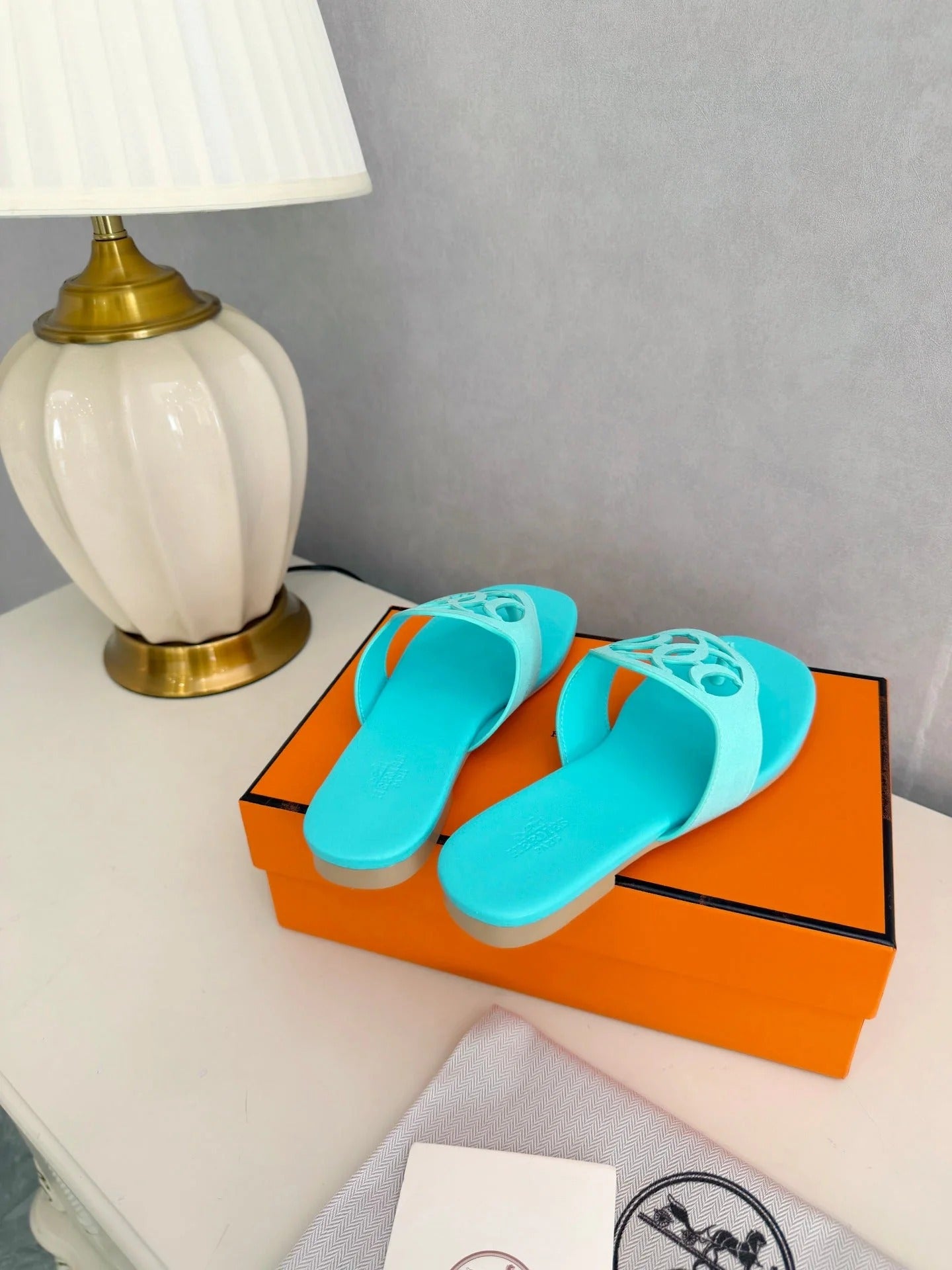 HM 26ss Pig-Nose Slipper Turquoise Leather 605904