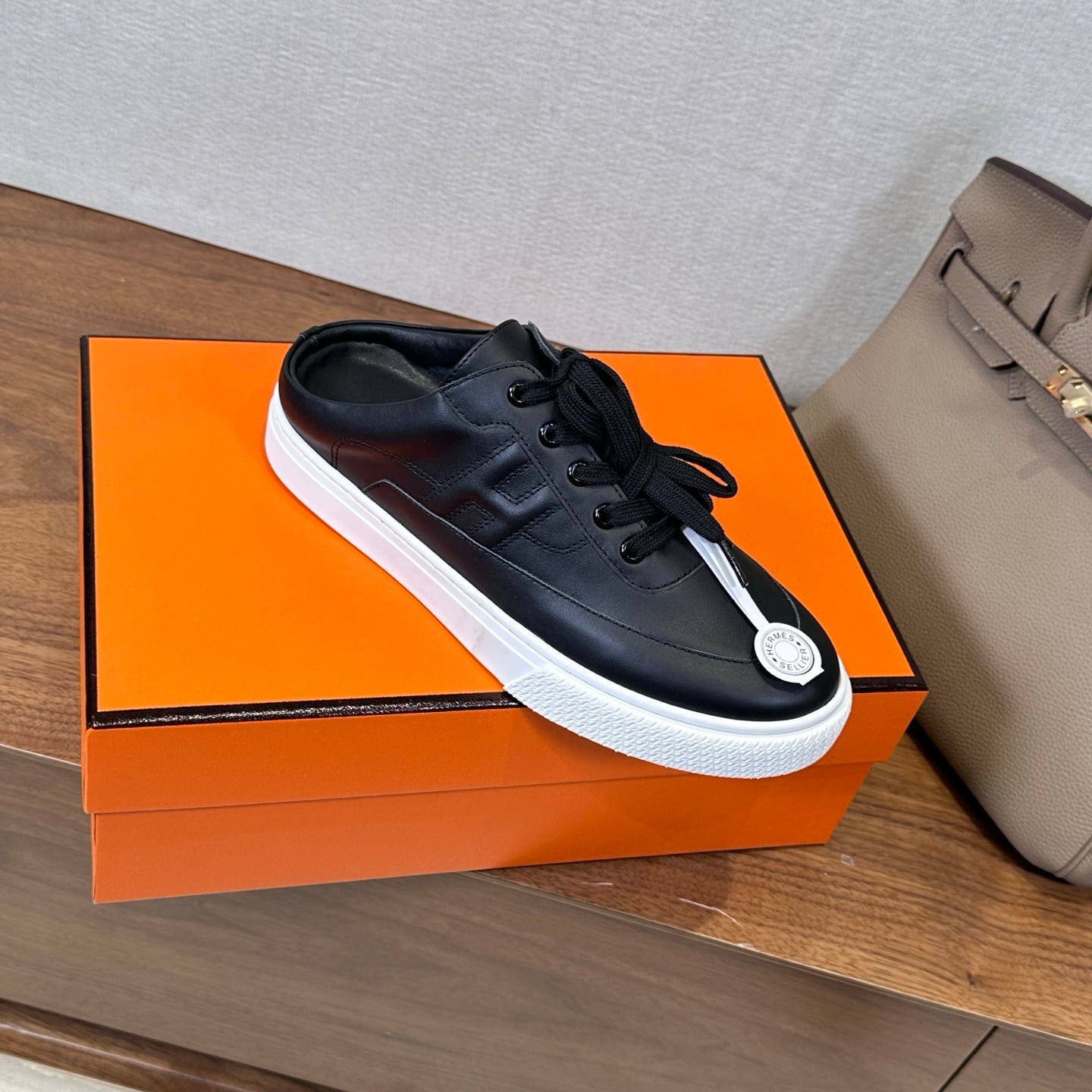 HM 25ss Kelly Buckle Sneakers Black Gray Cowhide Canvas 577490