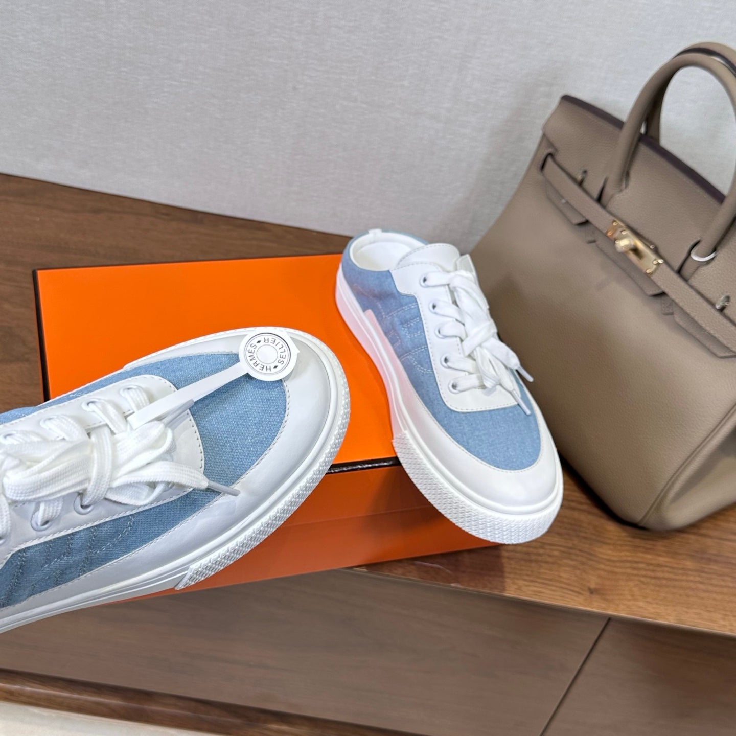 HM 25ss Kelly Buckle Sneakers Pink Gray Cowhide Canvas 577488