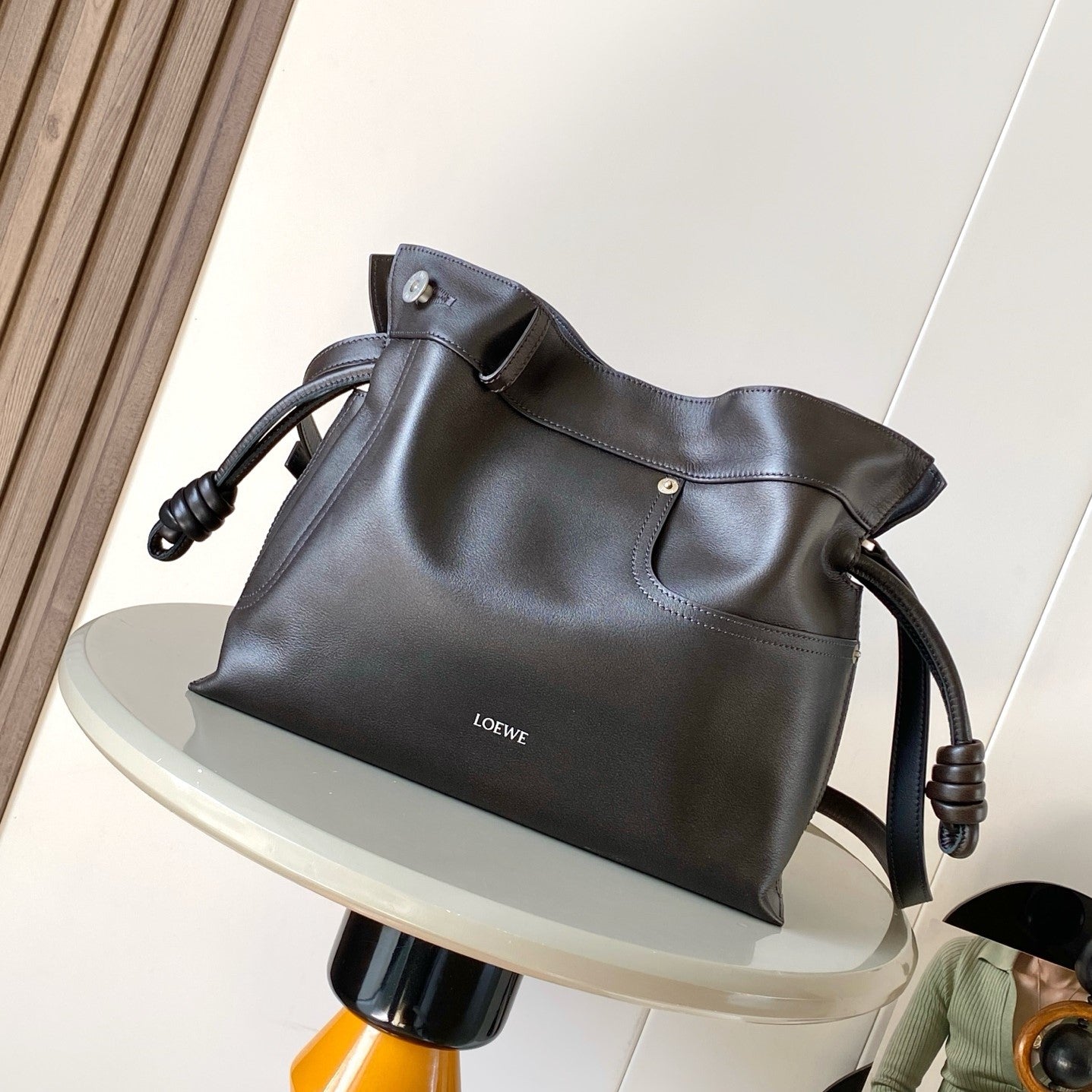 LOE MEDIUM 30 FLAMENCO PURSE BUCKET IN BLACK LAMBSKIN