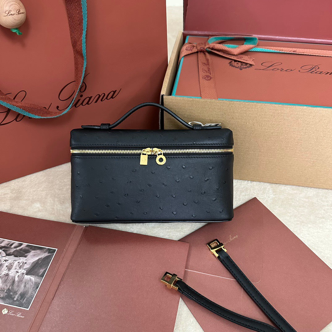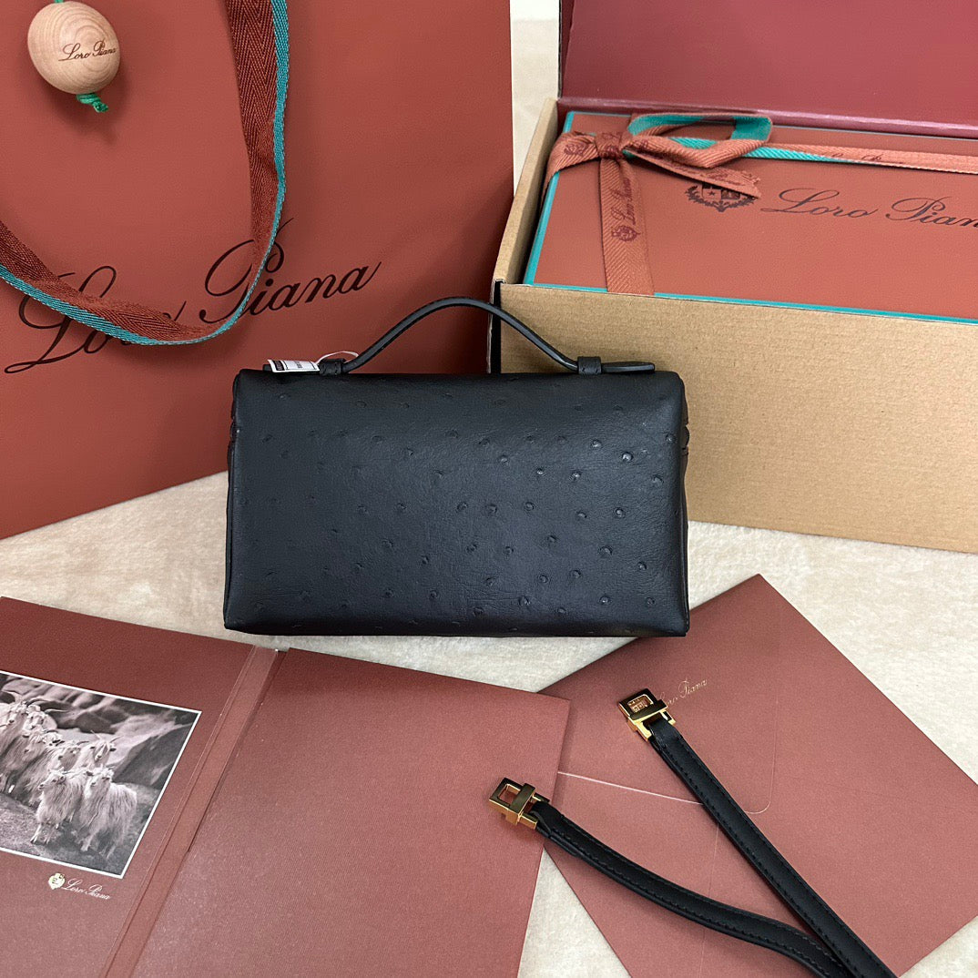 EXTRA POCKET L19 IN BLACK OSTRICH WITH GOLD HARDWARE