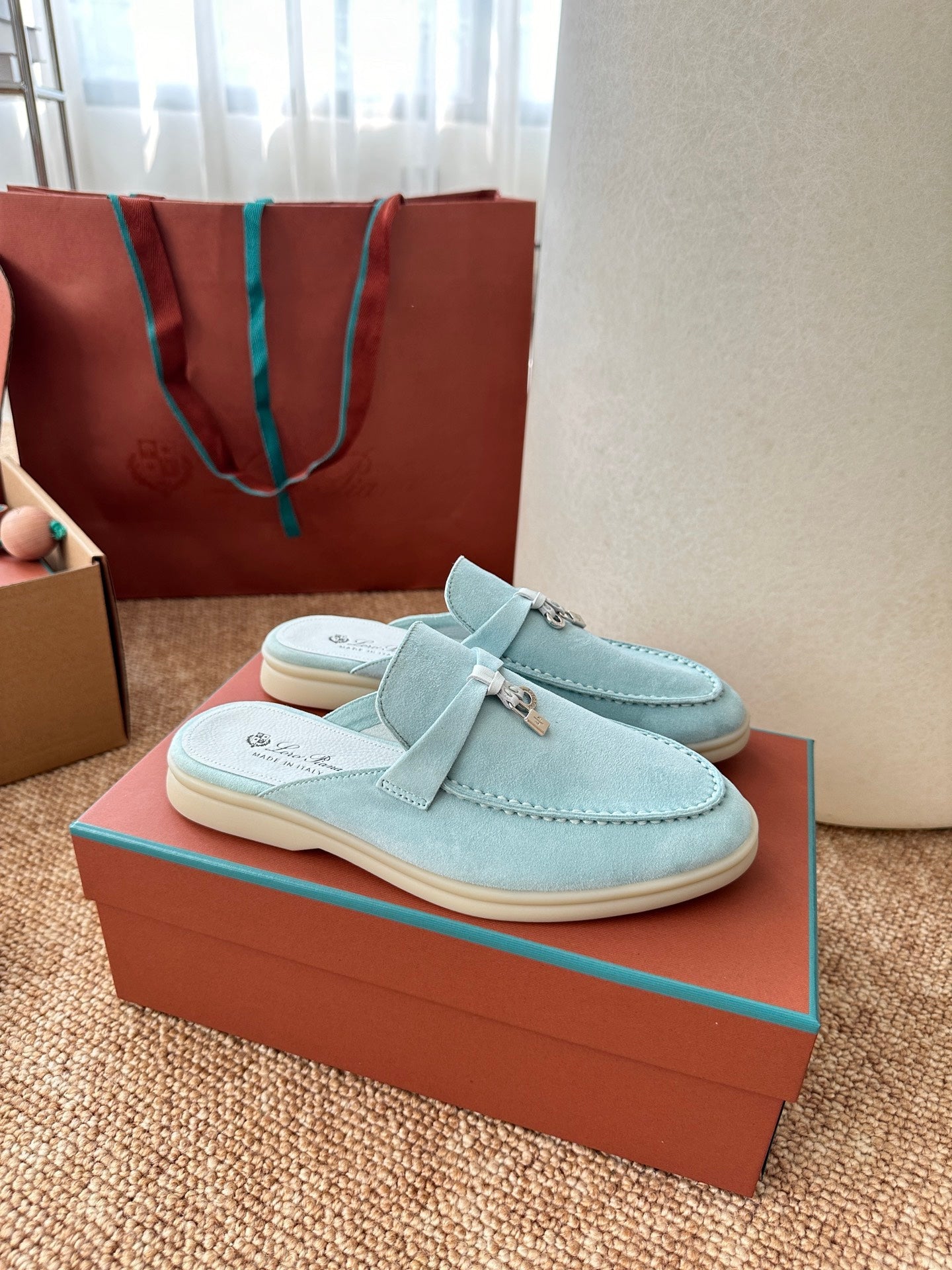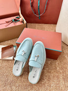Loro Piana Charms Walk Flat Mules Pale Blue Suede 623551