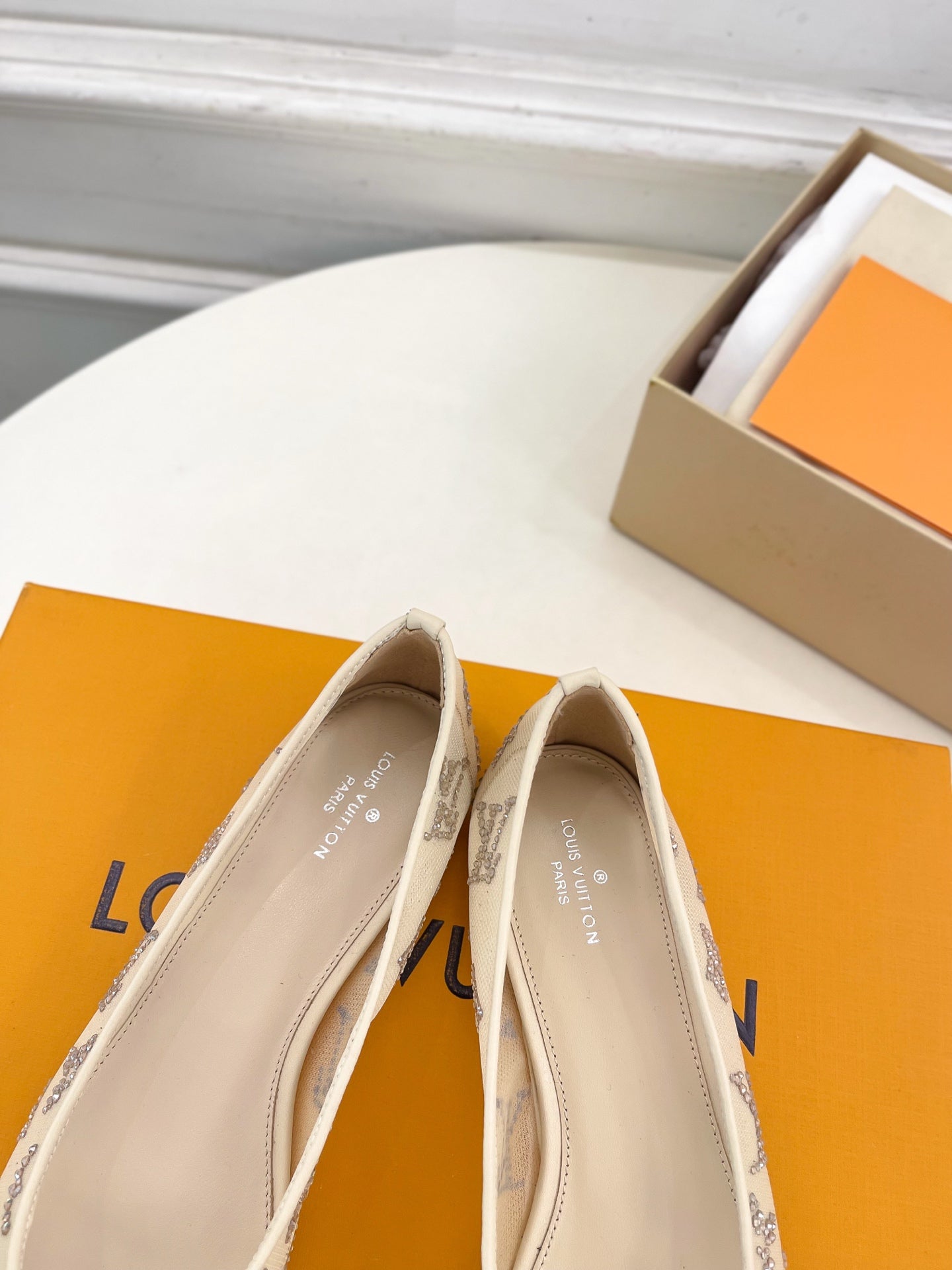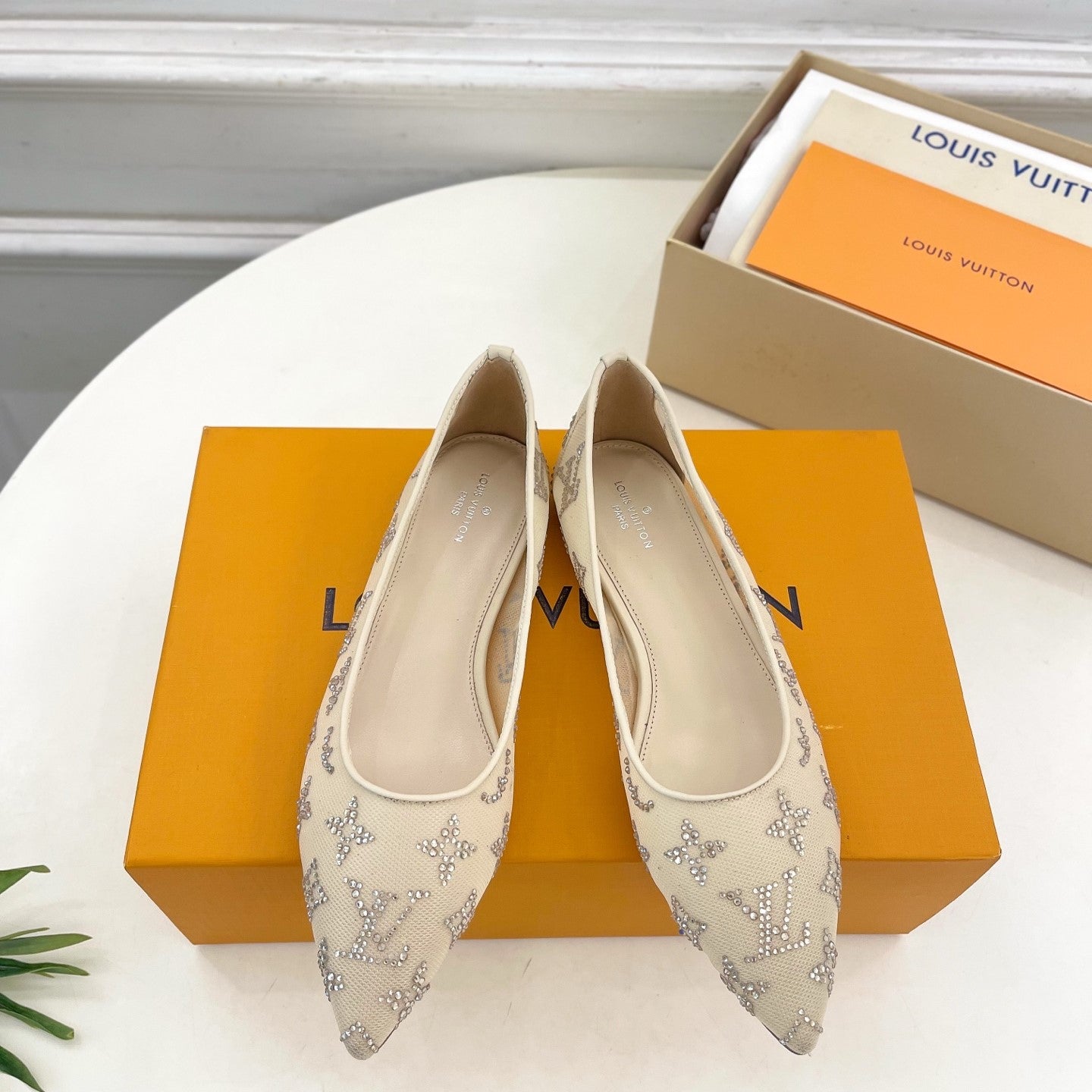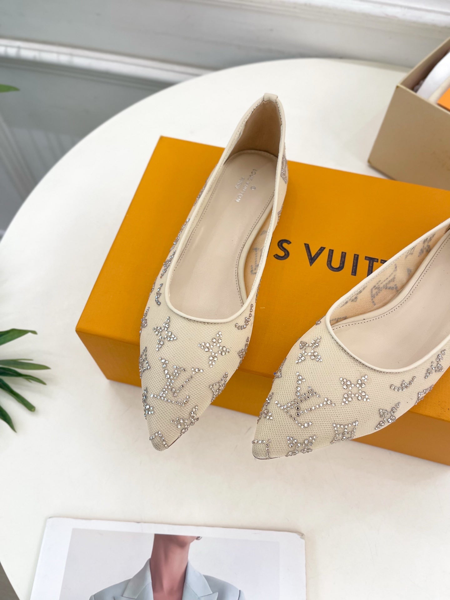 LV Gala Rhinestone Pointed Toe Flat Beige Mesh 425137