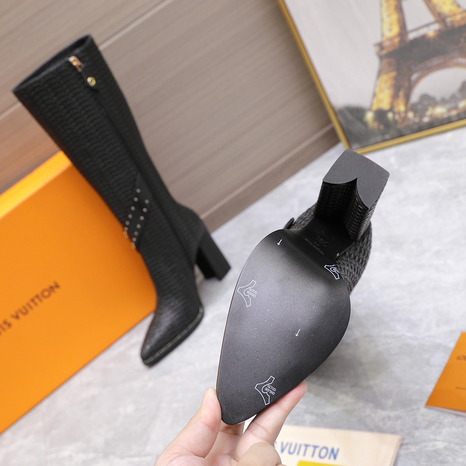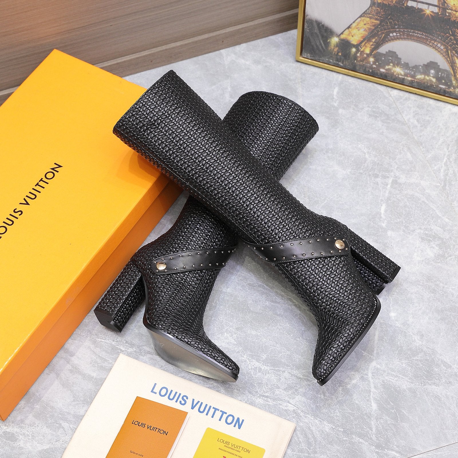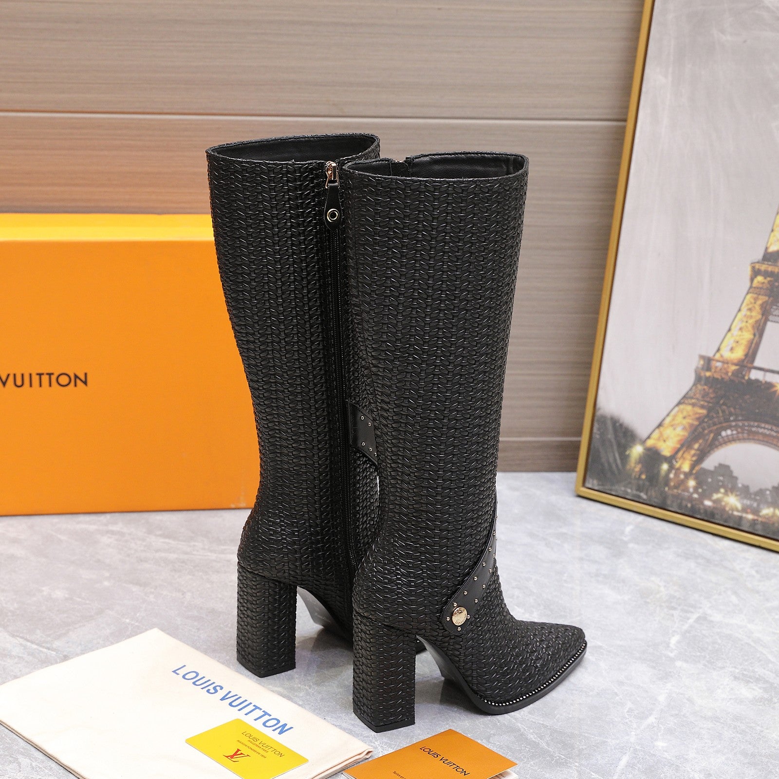LV x Silhouette Basketweave Pattern Long Boots 95mm Black Leather 425686