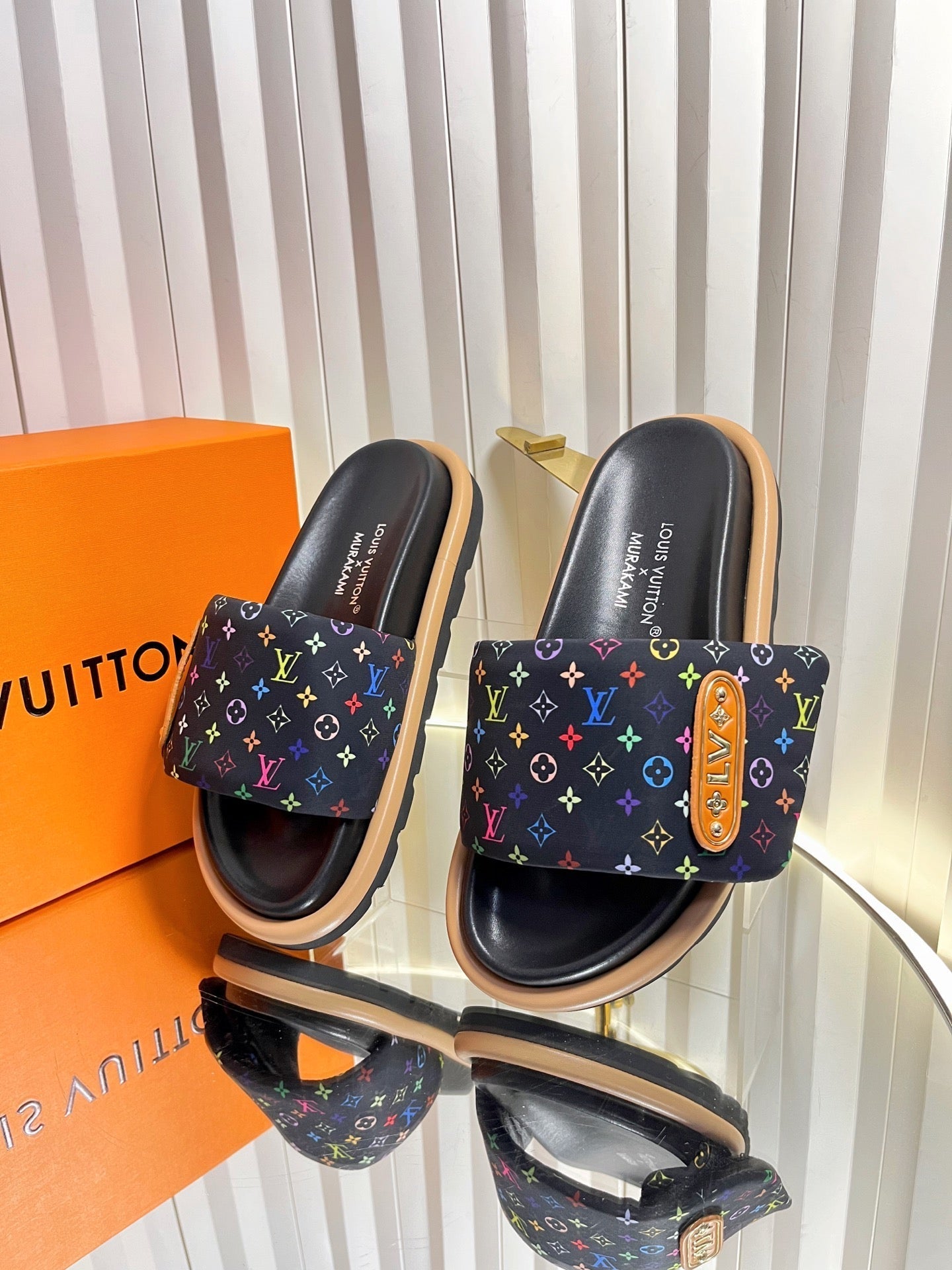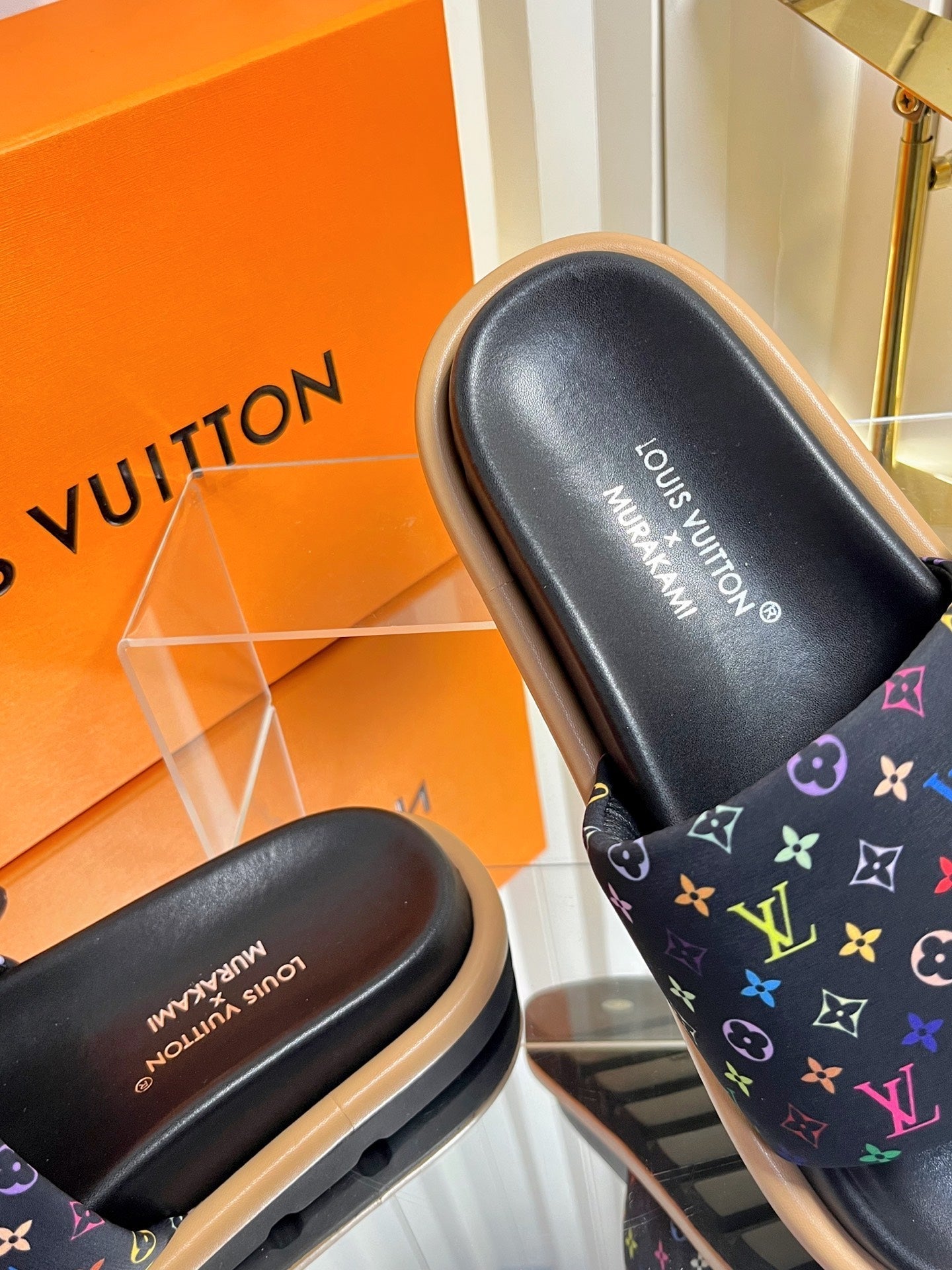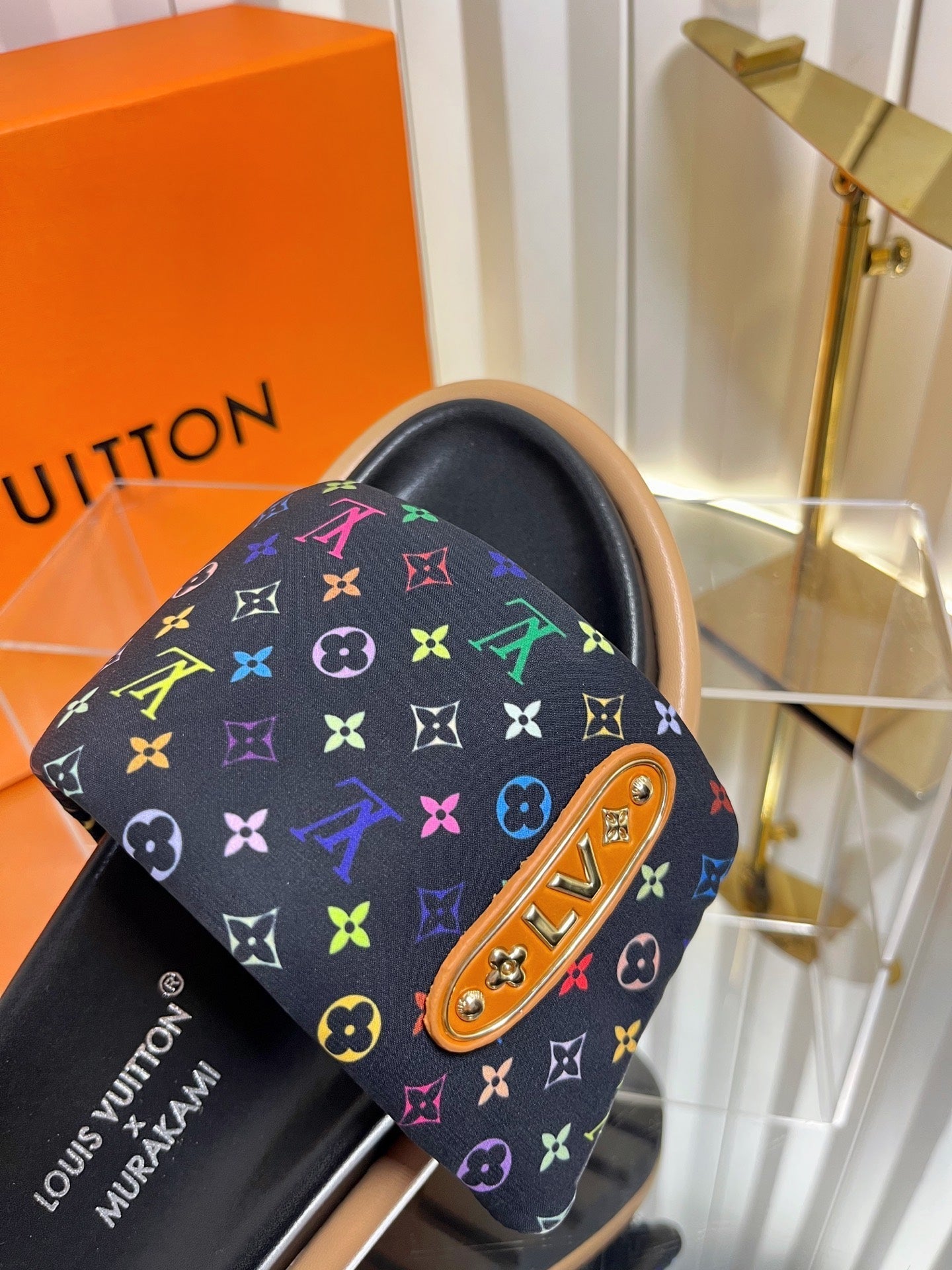 LV 26s Slippers Black Multicolor Fabric Sheepskin 616354