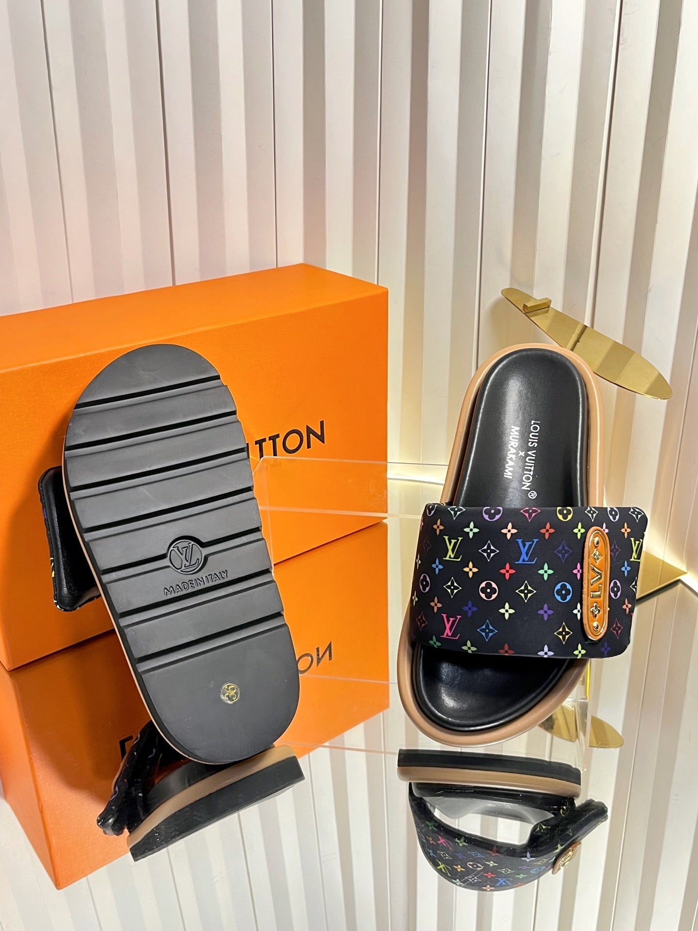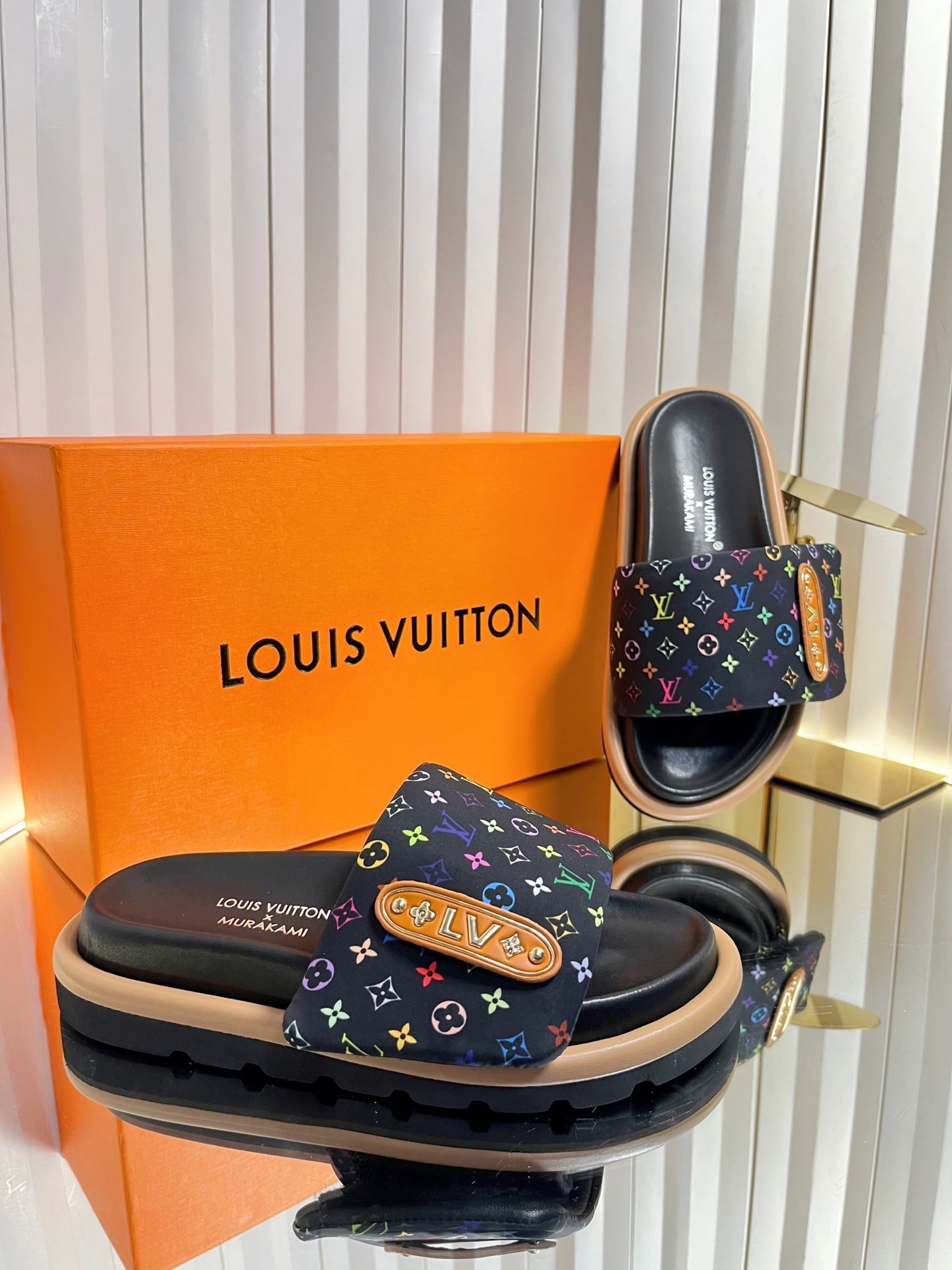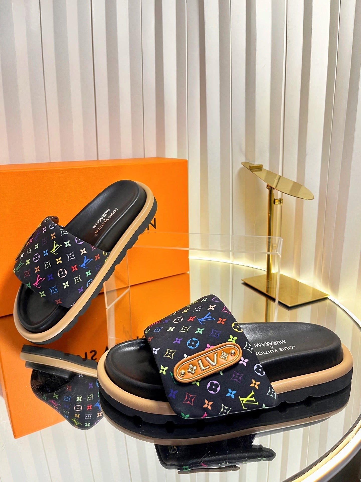 LV 26s Slippers Black Multicolor Fabric Sheepskin 616354