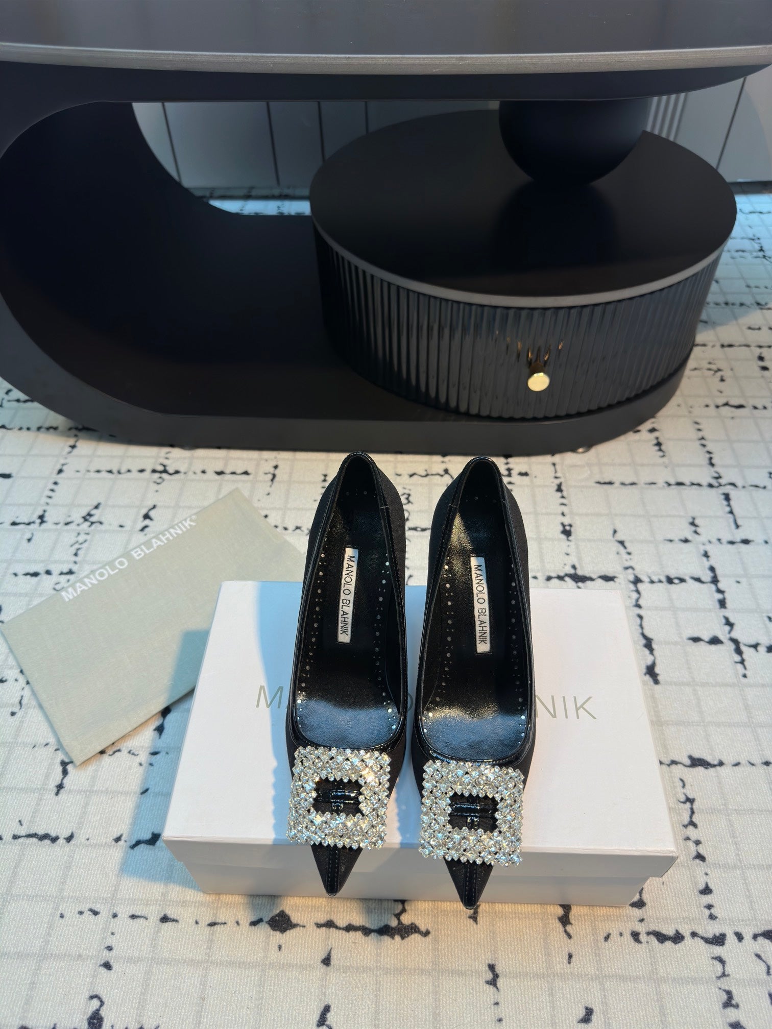 Hangisi 100 Black Linen and Leather Jewel Buckle Pumps 161067
