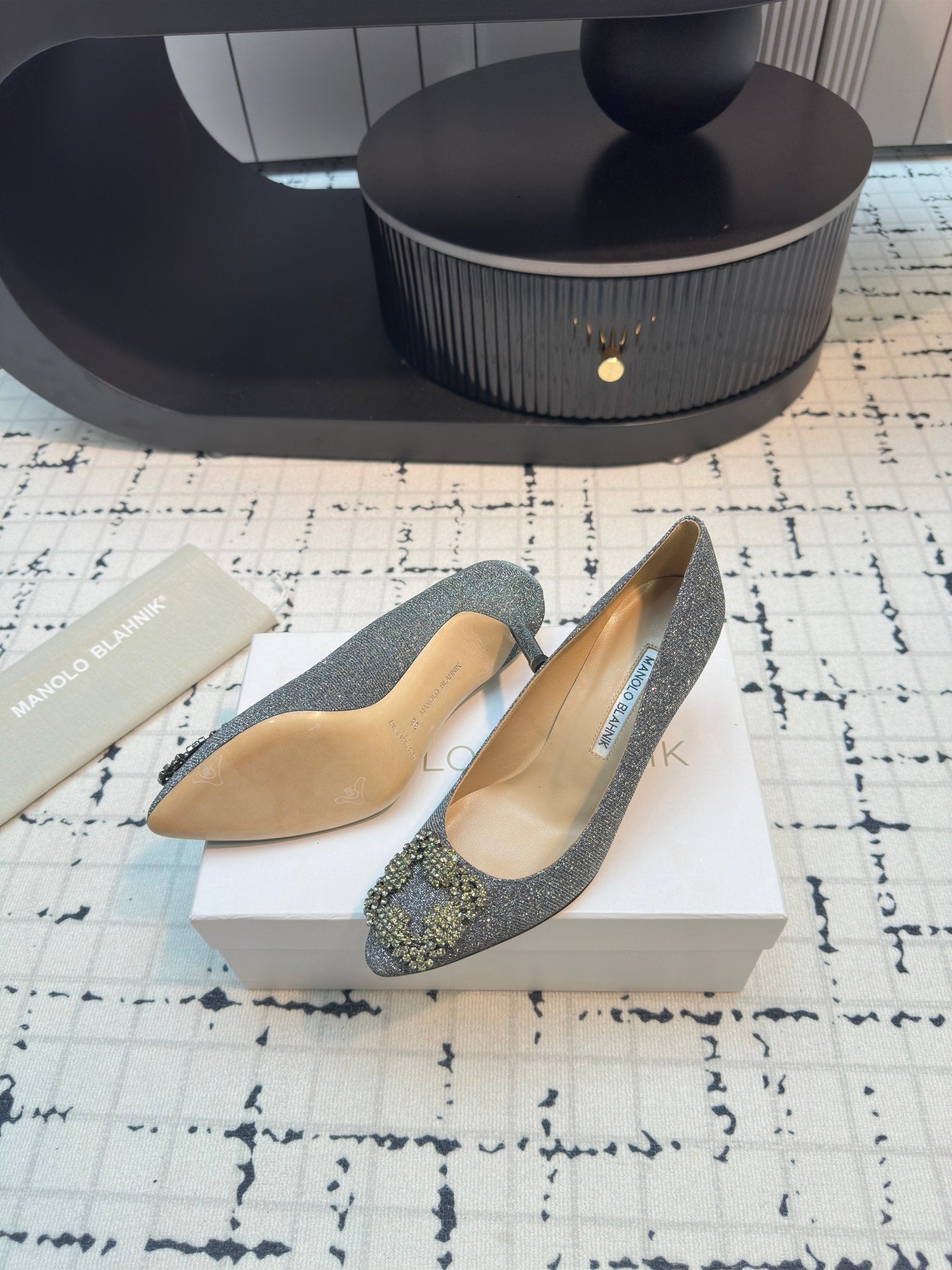 Hangisi 70 Silver Glitter Fabric Leather Jewel Buckle Pumps 912614