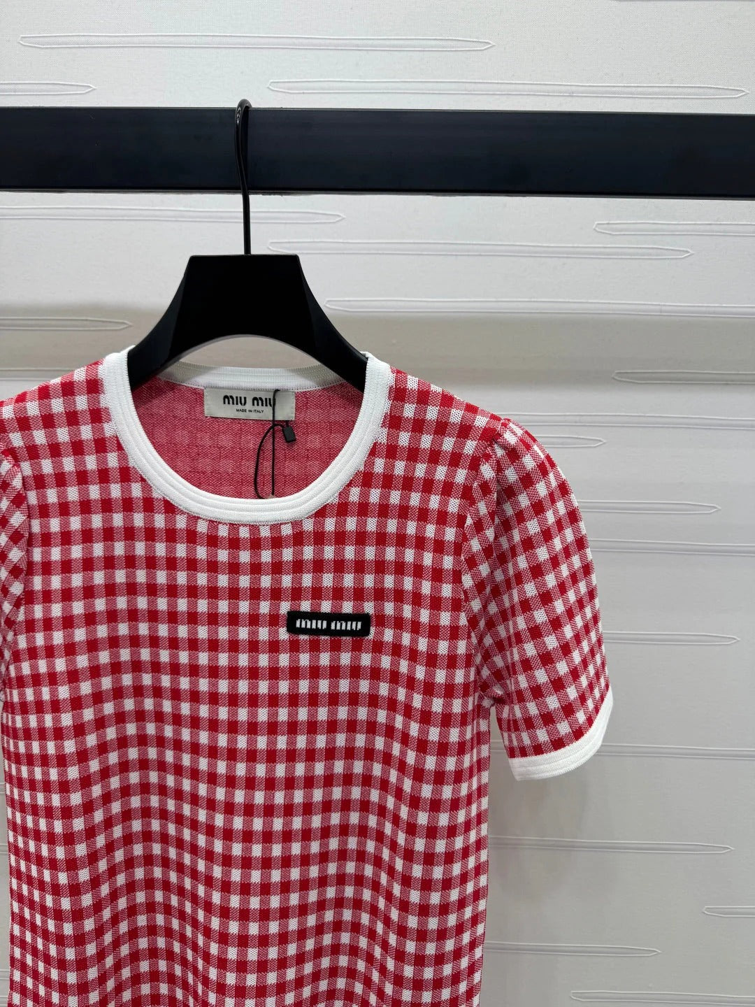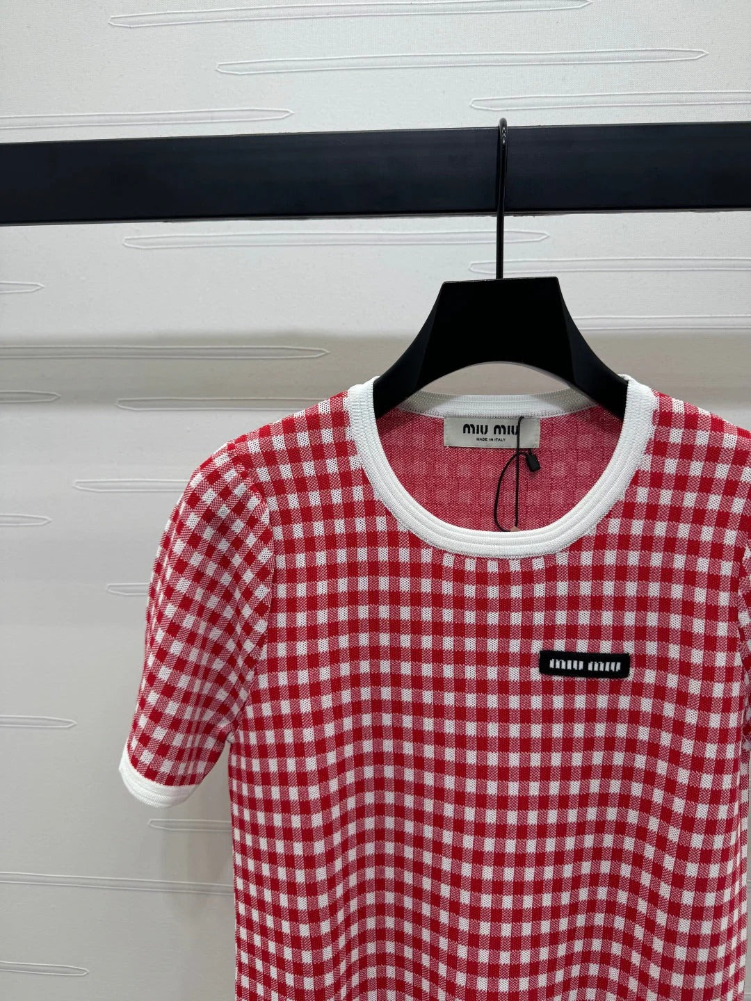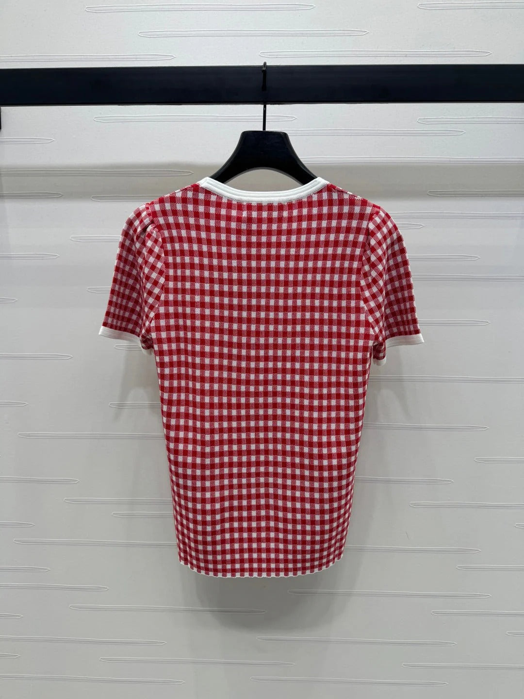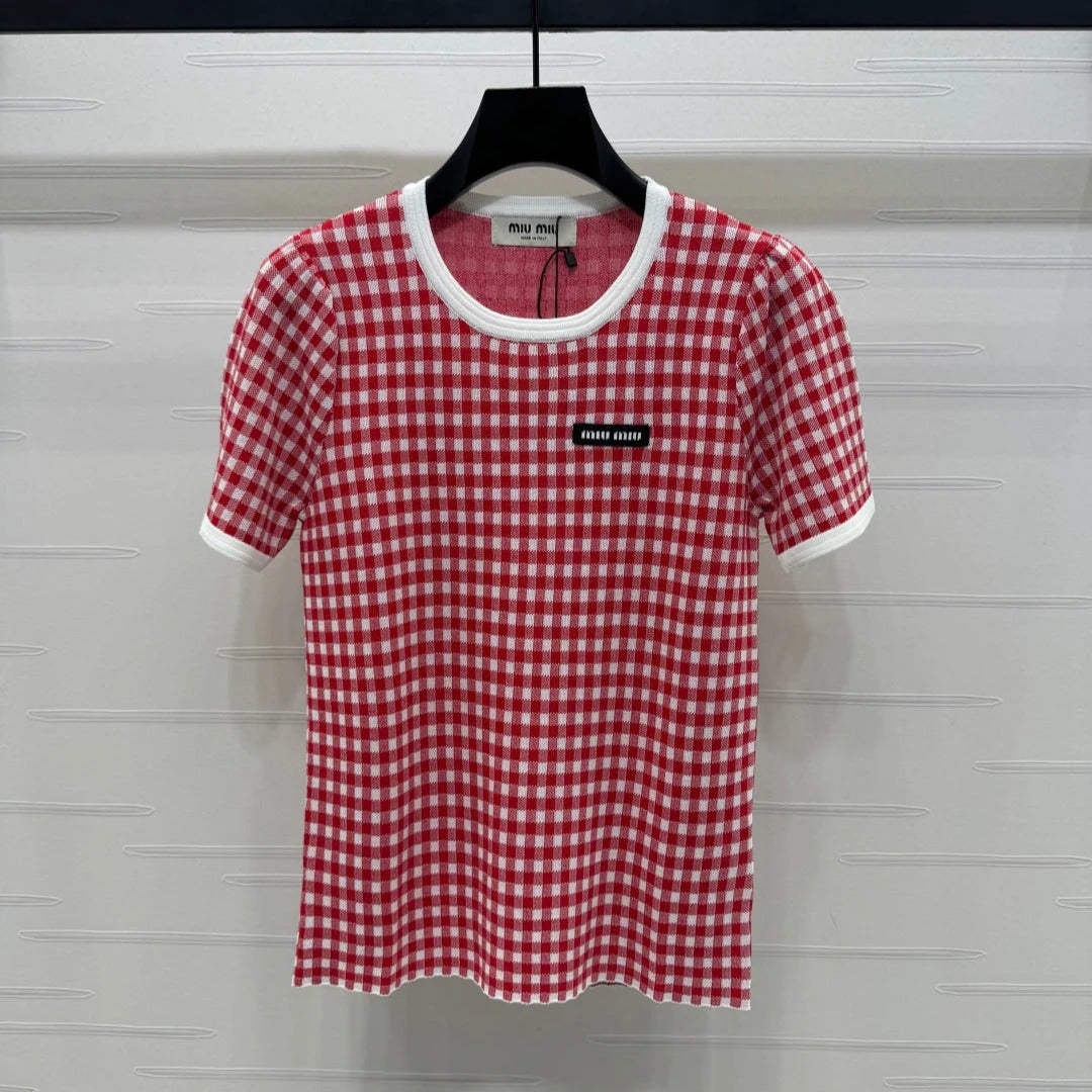 MIUMIU CREW NECK SHORT-SLEEVE PLAID KNIT TOP 274834