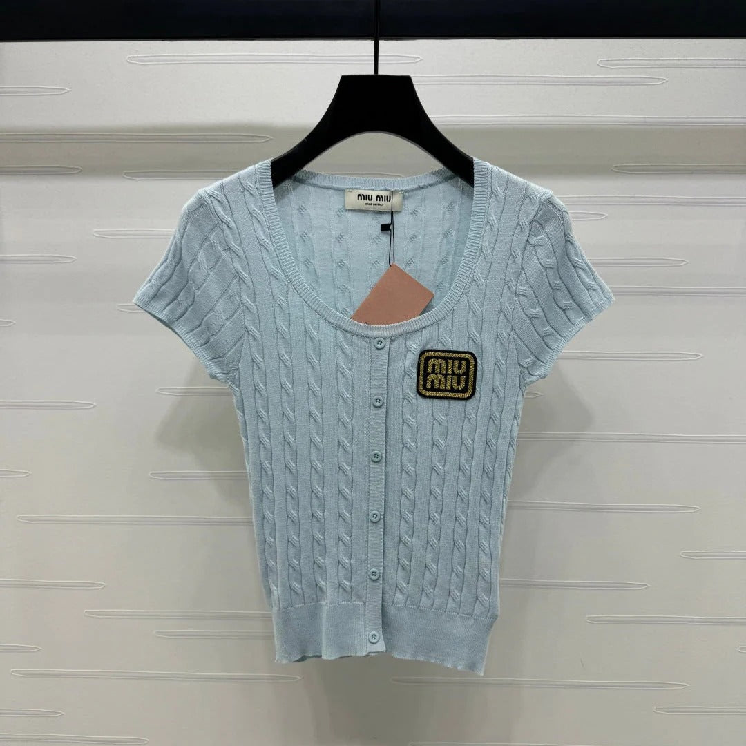 MIUMIU U-NECK KNITTED SHORT-SLEEVE TOP LIGHT BLUE 274948