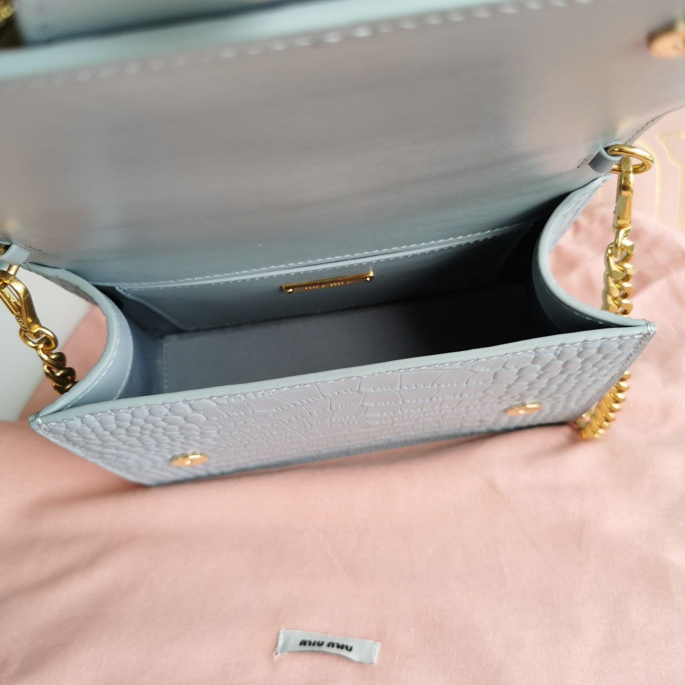 LADY 20 HANDBAG IN CROCODILE PATTERN BLUE MINT CALFSKIN
