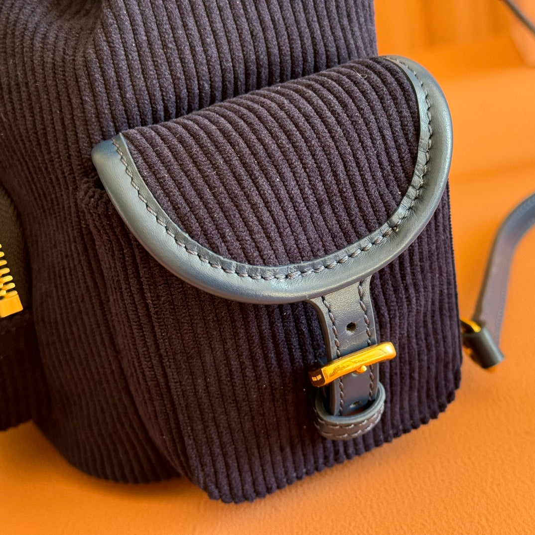 Miu Small Corduroy Backpack Navy Blue Leather-Trim