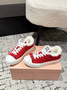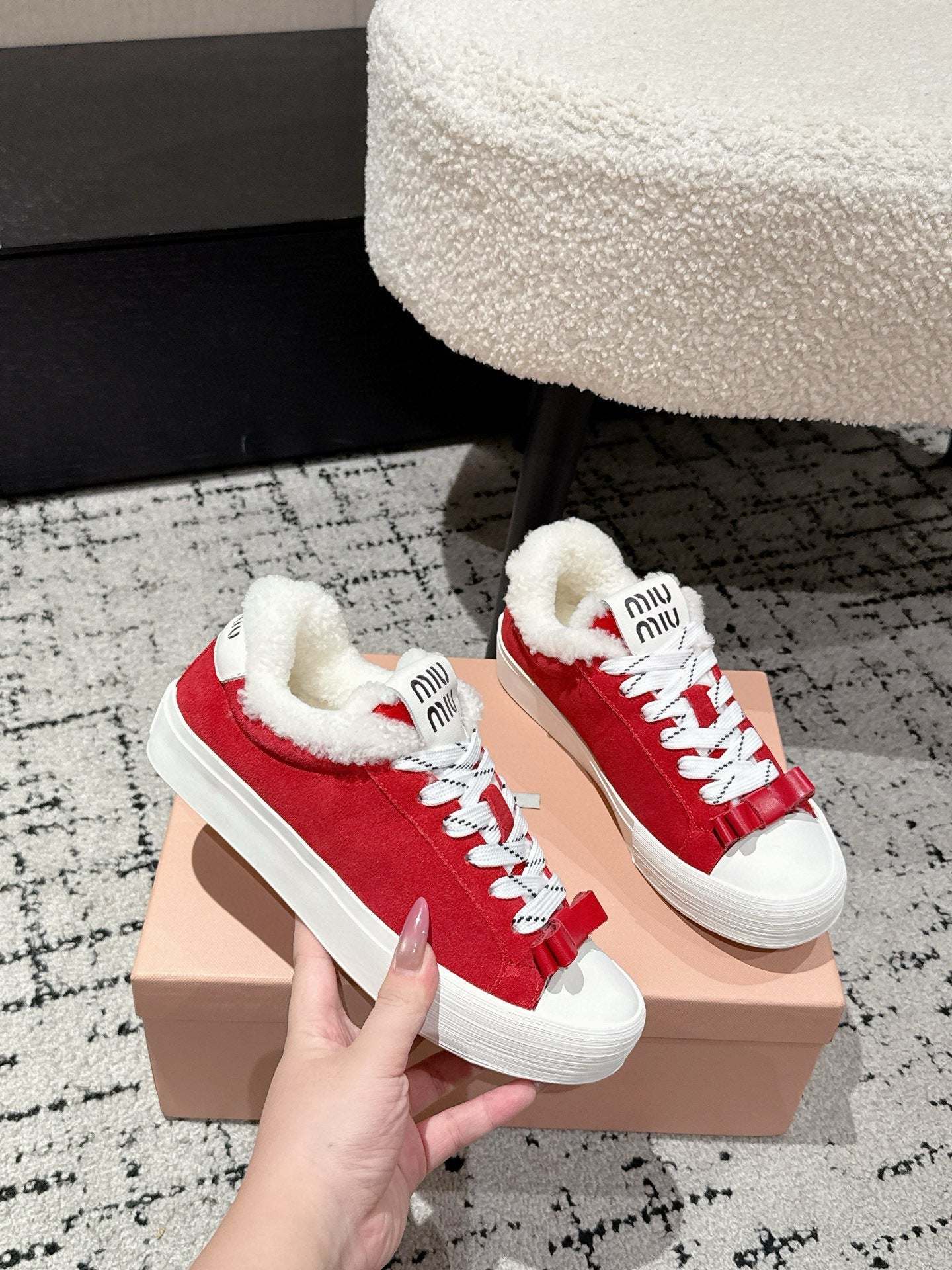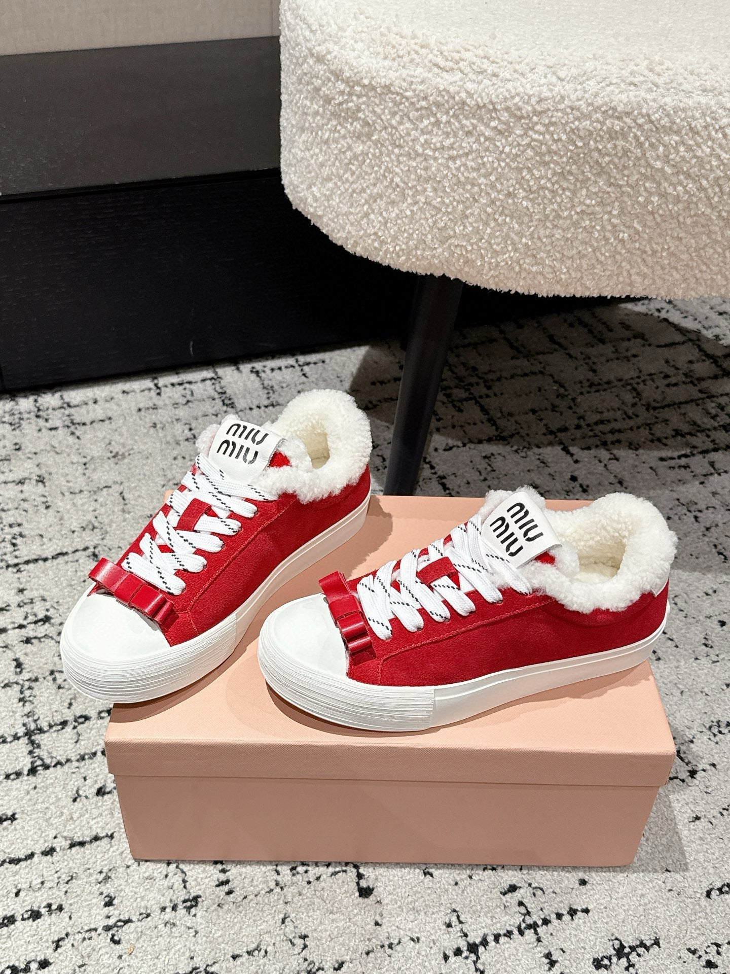 Miu 25 Small Bow Snealer Red White Suede Wool 541922