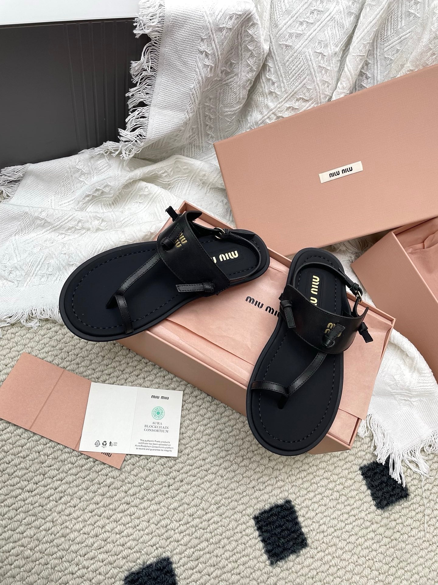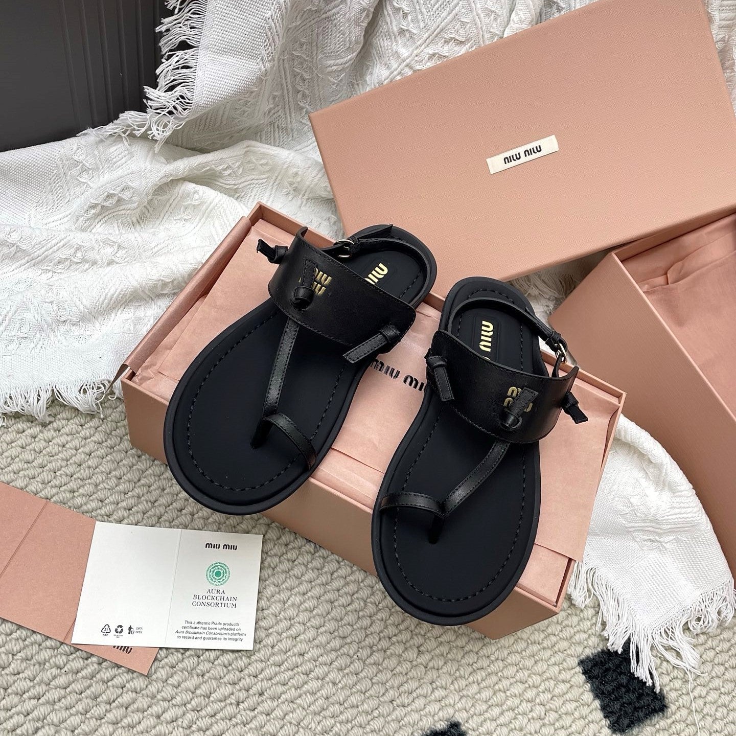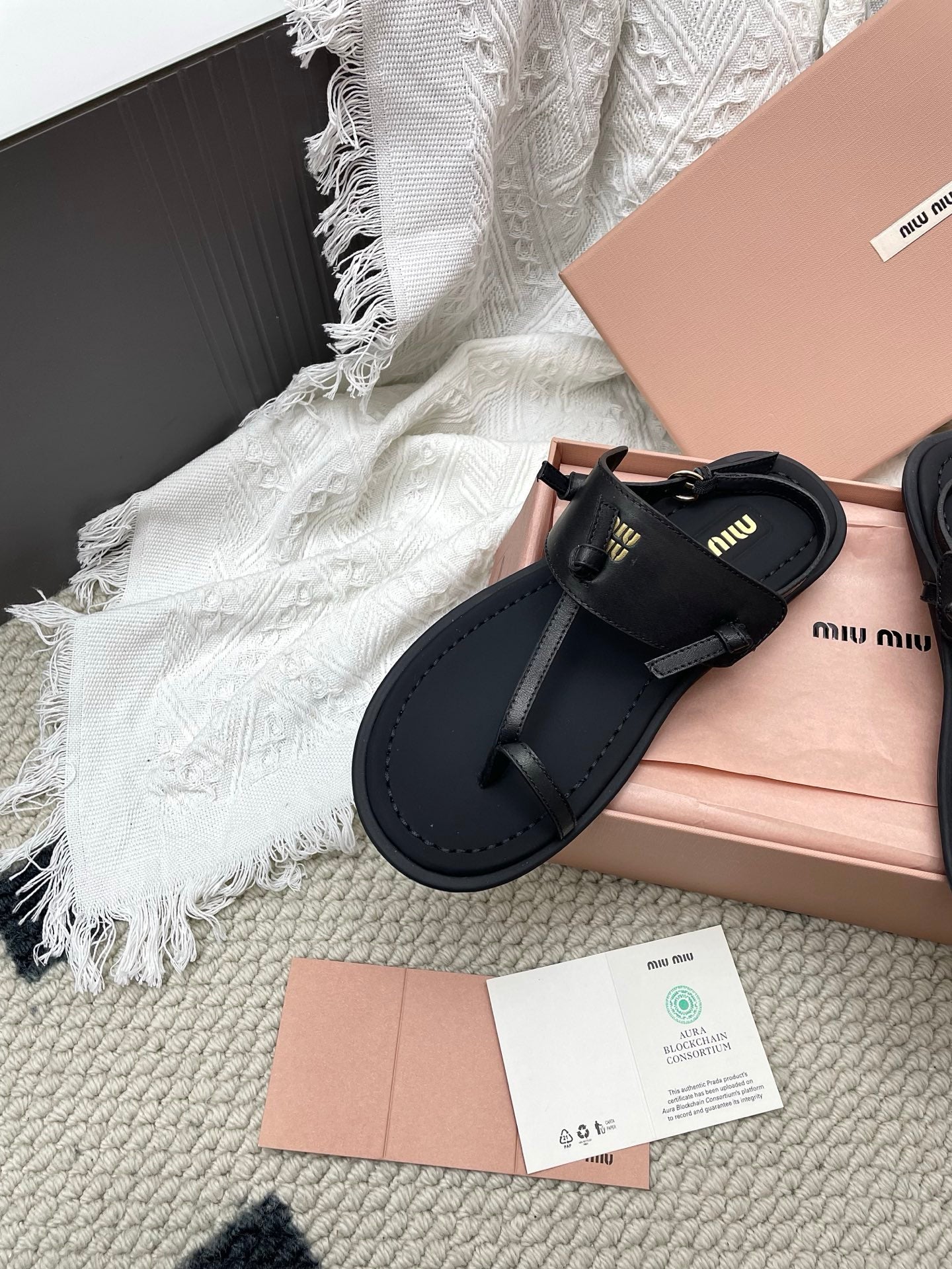 Miu 26 Flip-Flop Flat Sandals Black Leather 611340