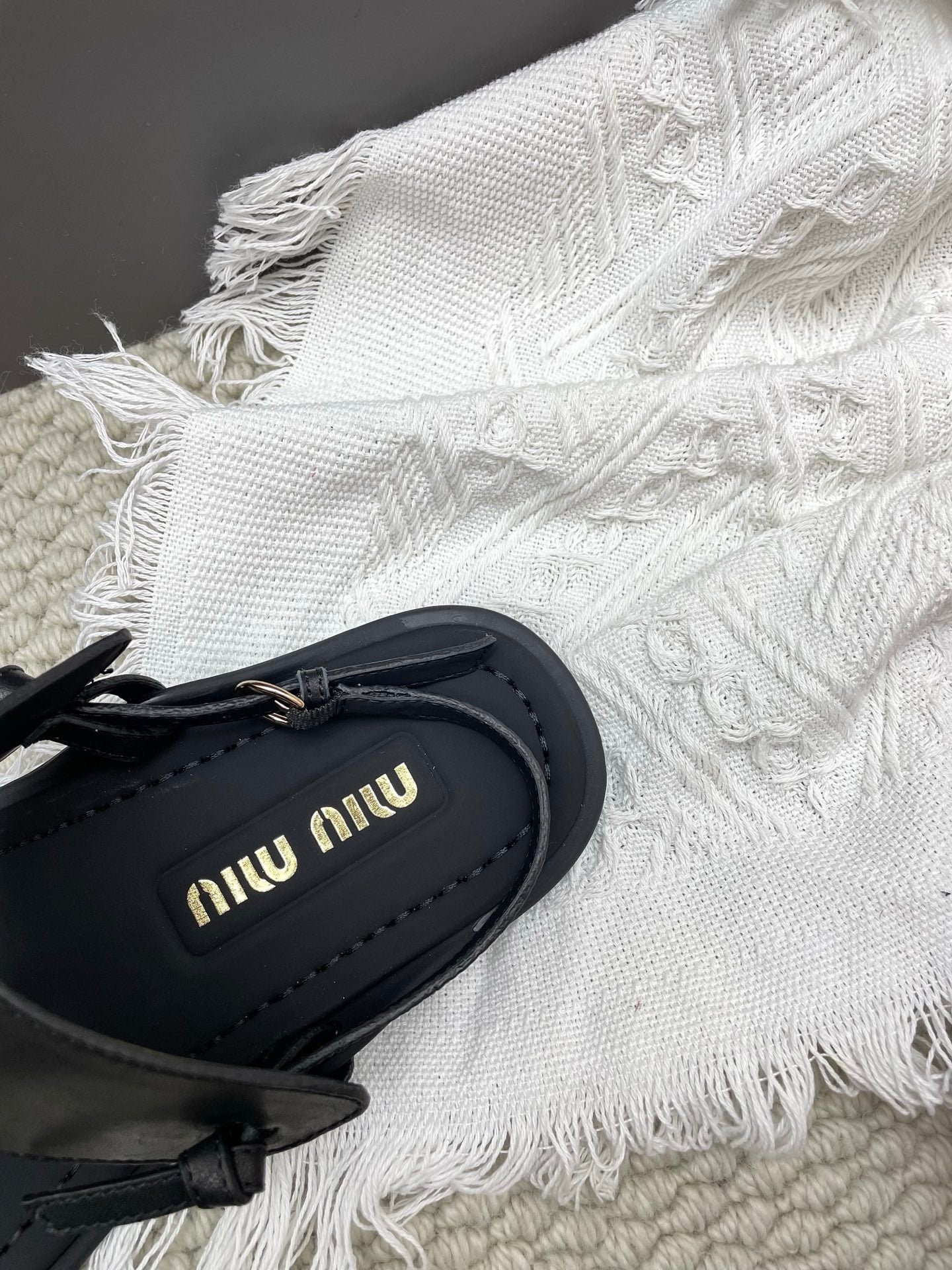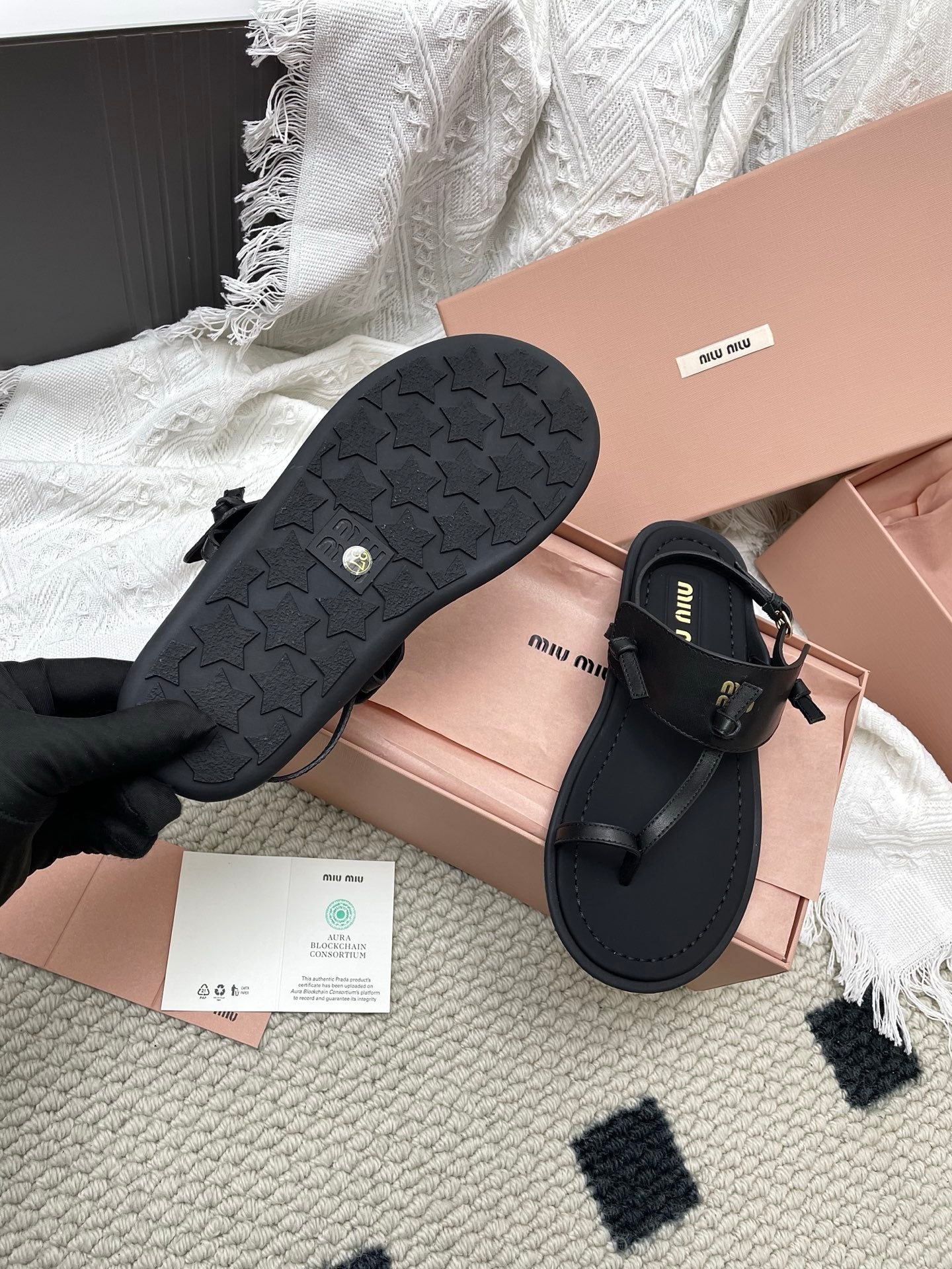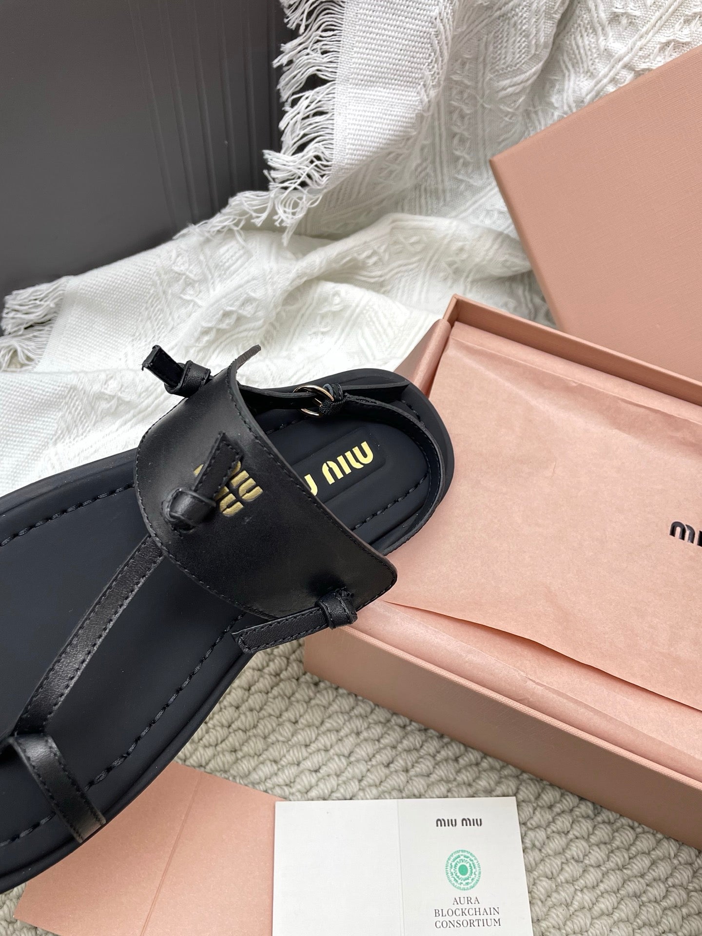 Miu 26 Flip-Flop Flat Sandals Black Leather 611340