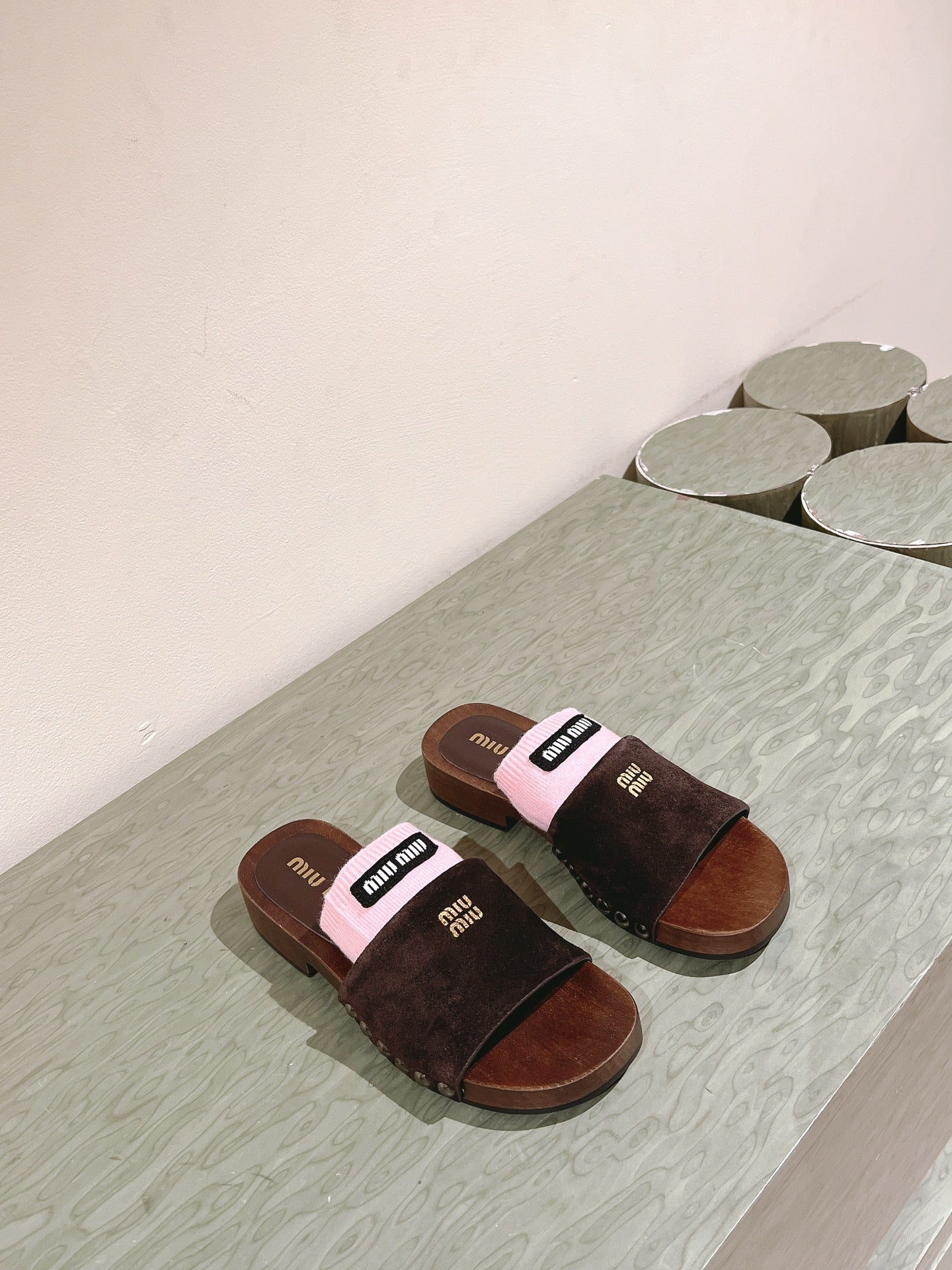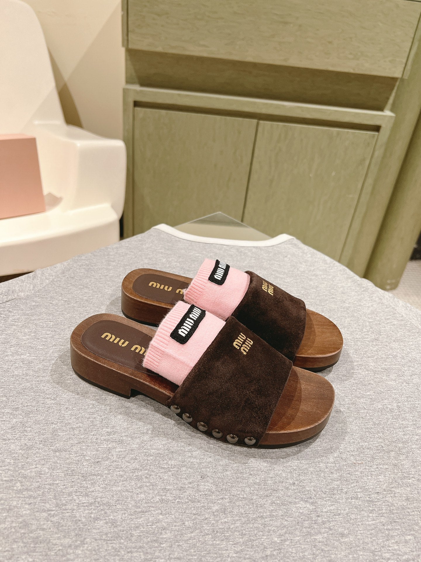 Miu Clogs 30mm Brown Pink Suede Wood 445657