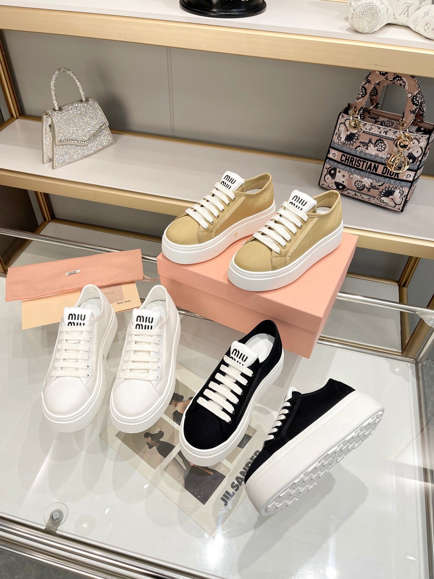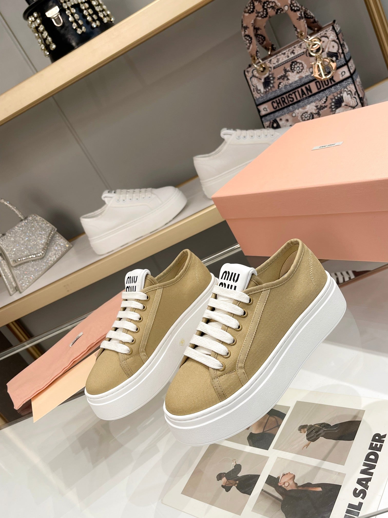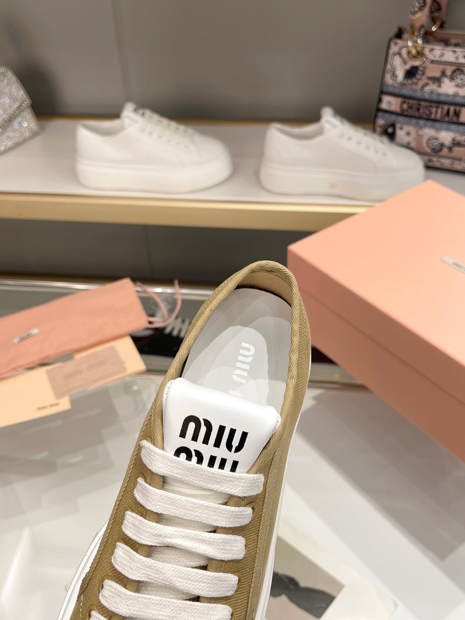 Miu Low Top Skateboard Shoes 50mm Golden Brown Canvas Cowhide 456835