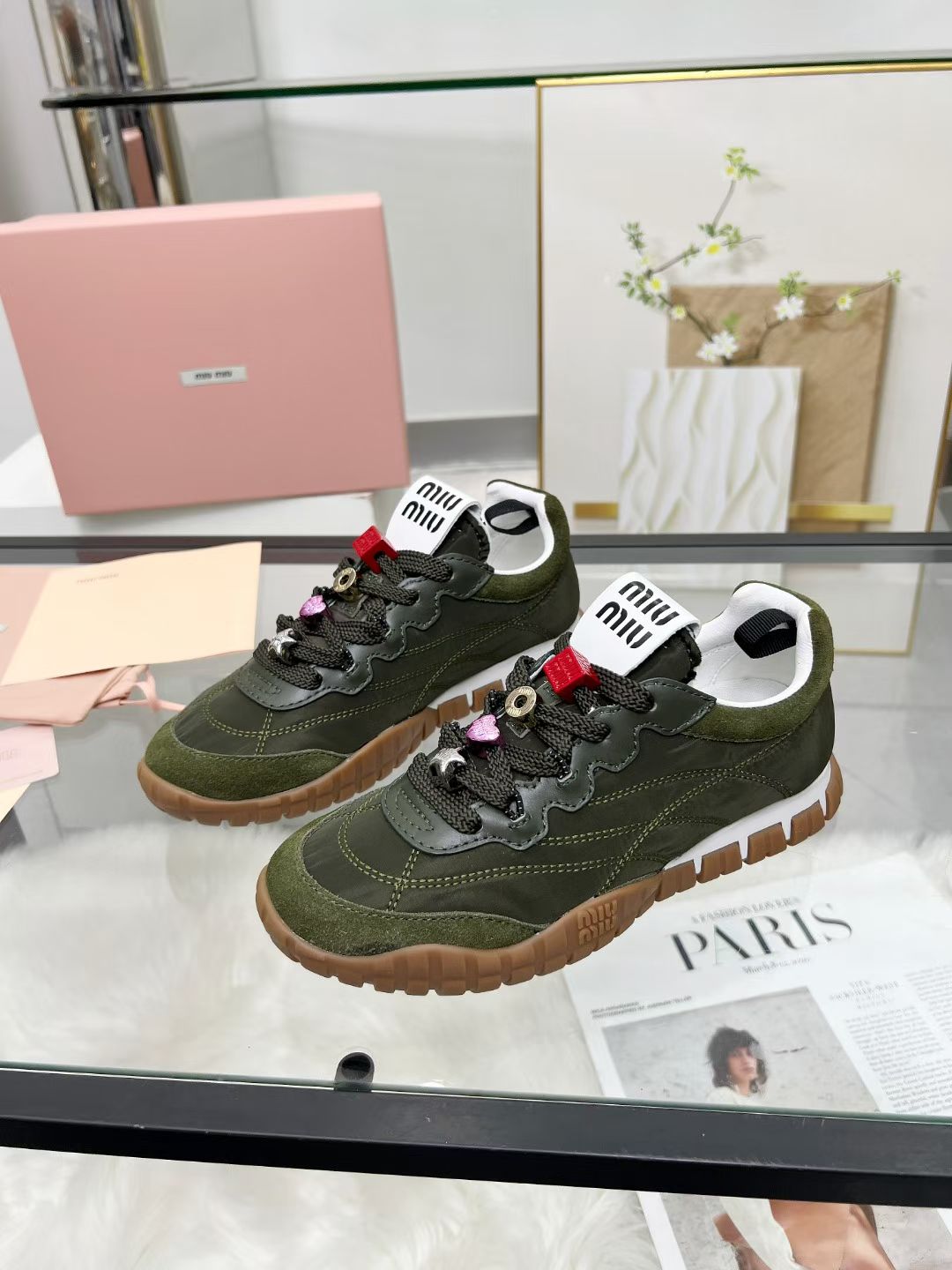 Miu TYRE Sneakers with Decorative Buckle Olive Green Suede Technical Fabric 456336