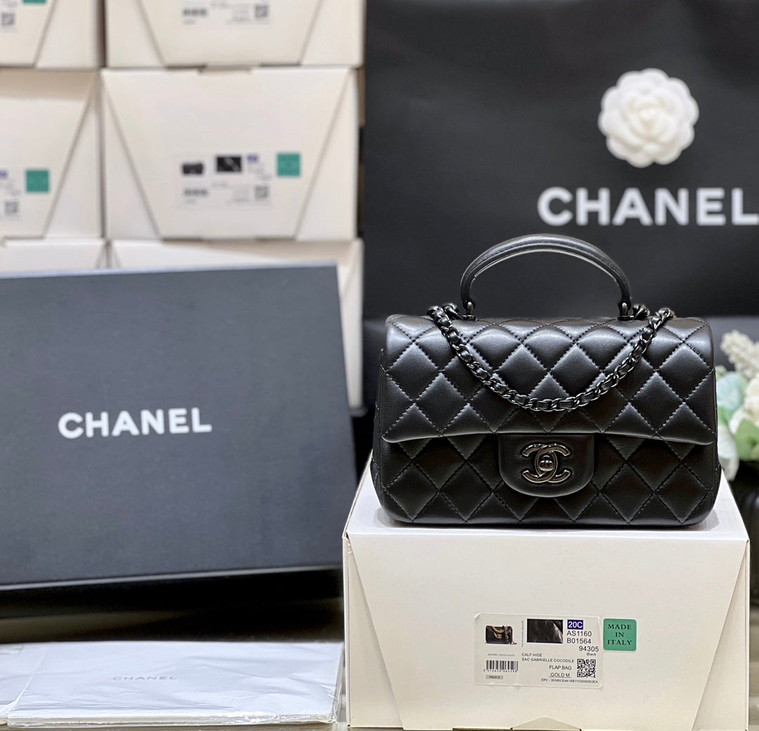 25C Mini Flap Bag Top Handle 20cm Black Lambskin Black Hardware