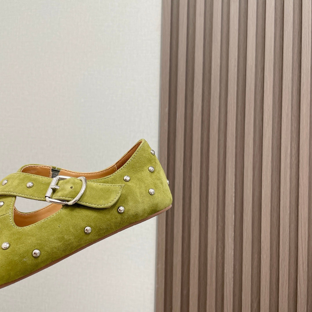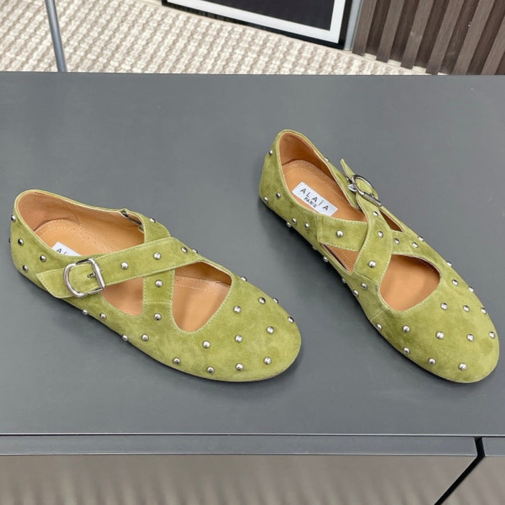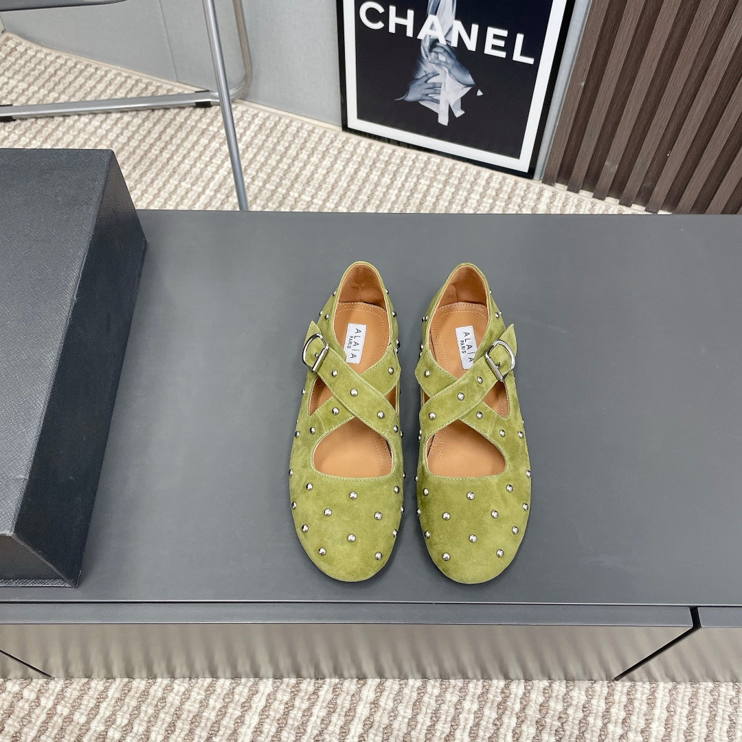 Alaia 2025 Criss Cross With Stud Ballet Flats Avocado Green Suede 293209