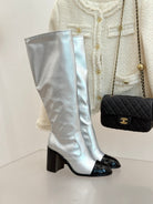 CC Classic Long Boots Block Heel 90mm Sliver Metalic Calfskin 465392