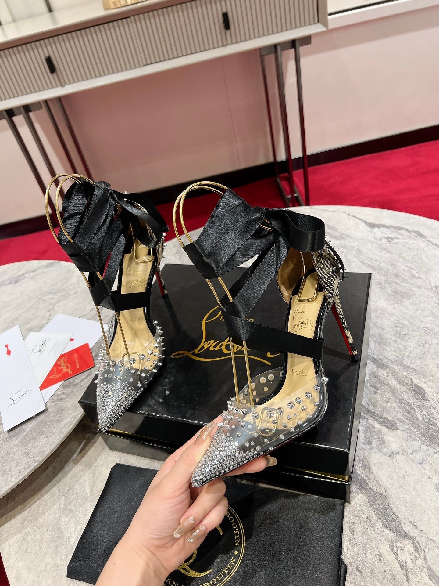 CL Mechante Reine Pumps 100mm Spike Fabric PVC Black