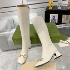 Gucci Horsebit Square Toe Mid-heeled Ankle High Boots White Cowhide 490538