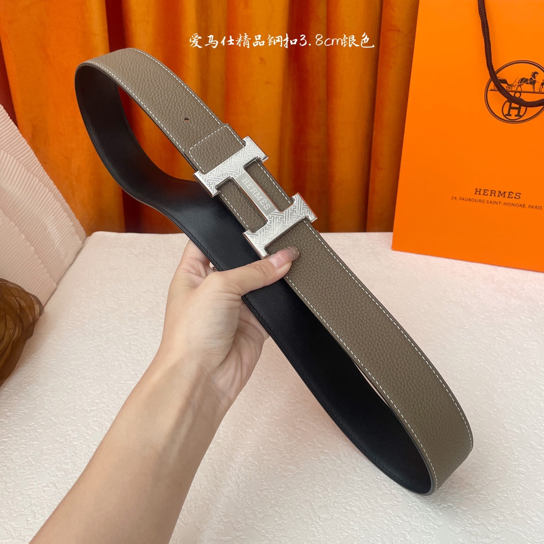 HM Silver Buckle H Belt 38mm Etoupe Calfskin 187184