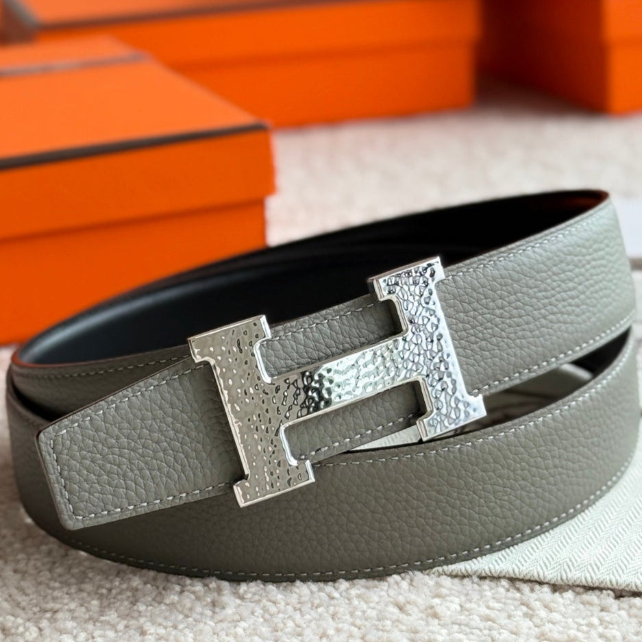 HM Silver H Guillochee Buckle Belt 32mm Gray Green Leather 187598