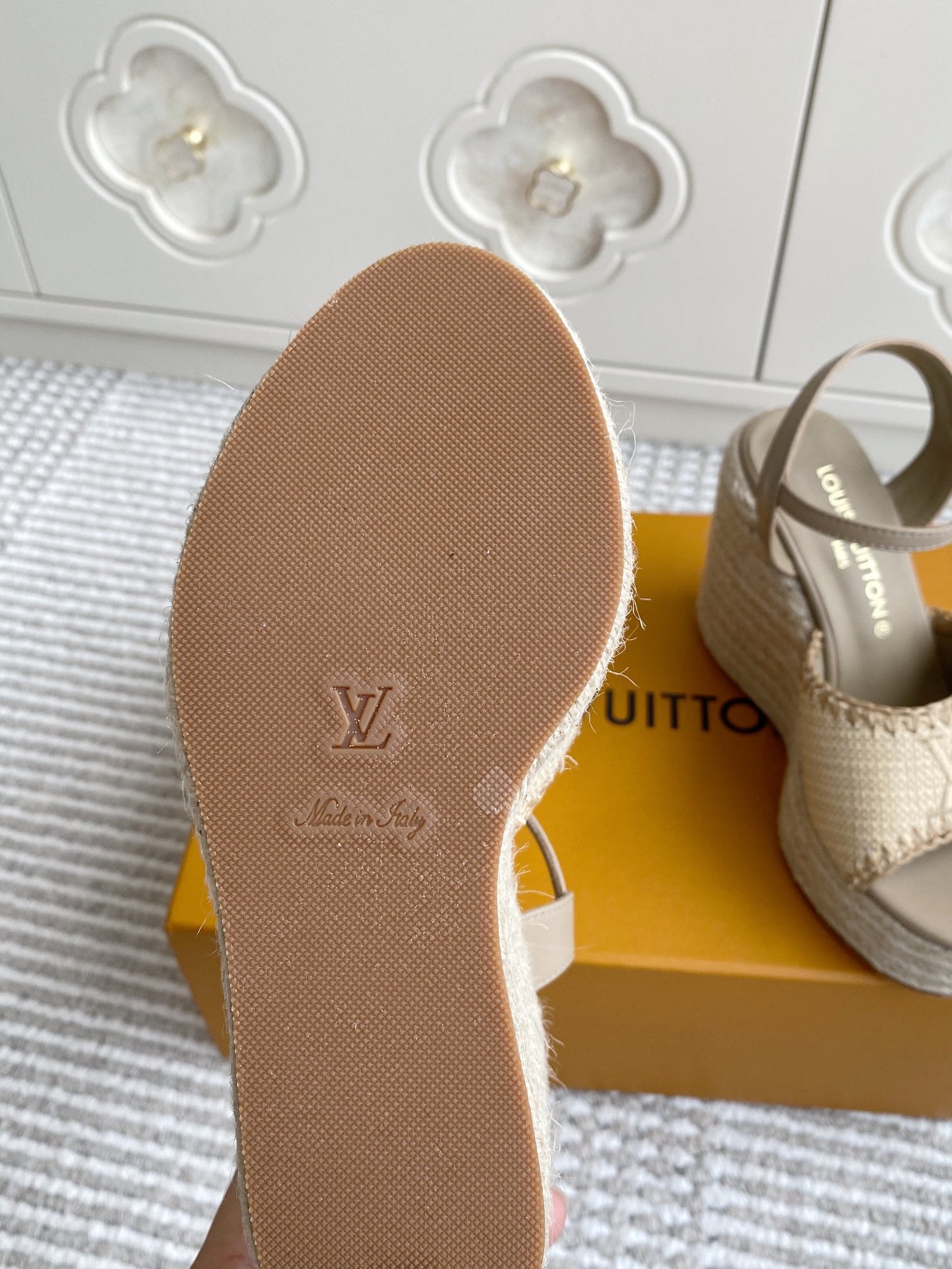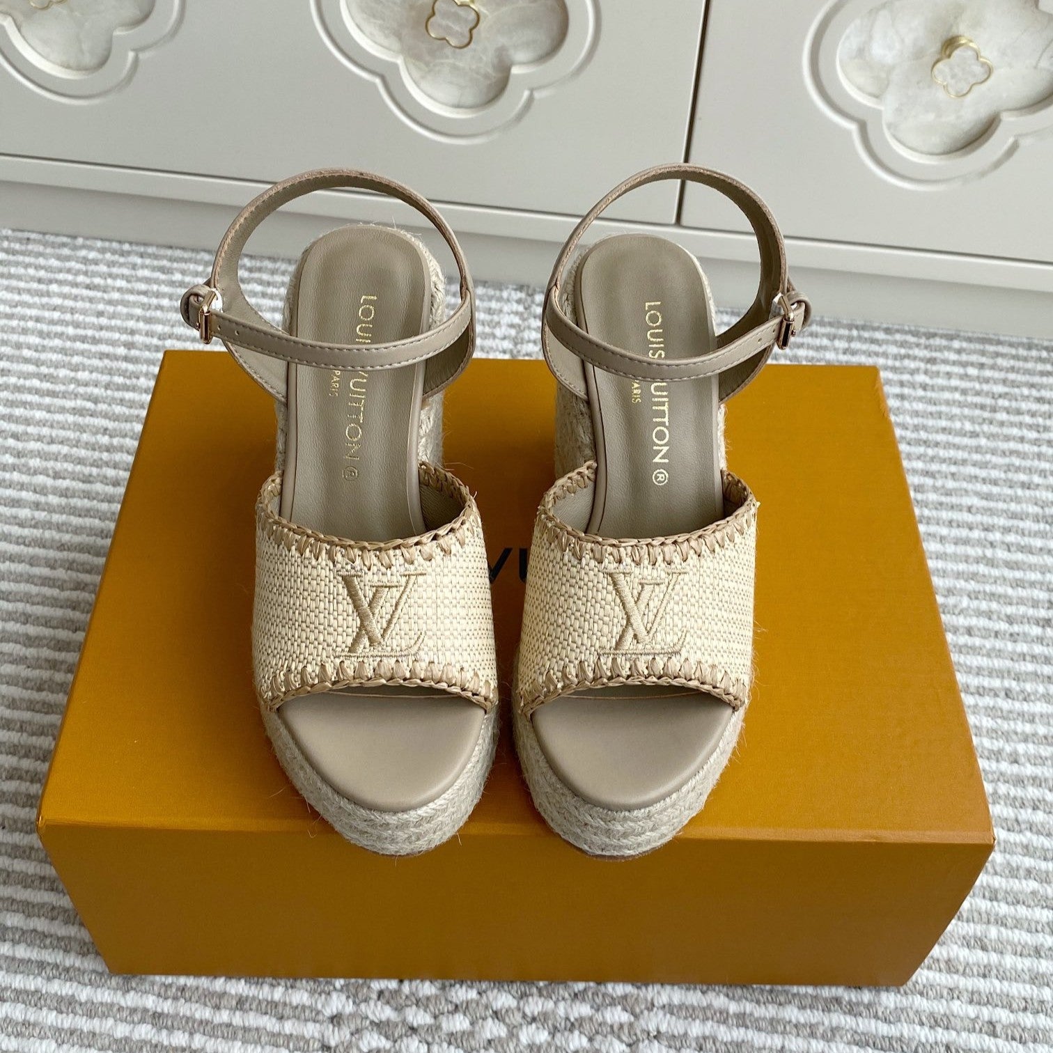 LV Beige·Raffia Straw Wedge Sandals 11.5cm Light Brown Lining Leather 291590
