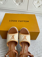 LV Beige·Raffia Straw Wedge Sandals 7.5cm Gold Lining Leather 291587