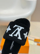 LV Fur Slippers Black With White Text Pure Wool