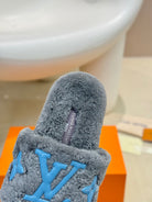LV Fur Slippers Gray With Blue Text Pure Wool